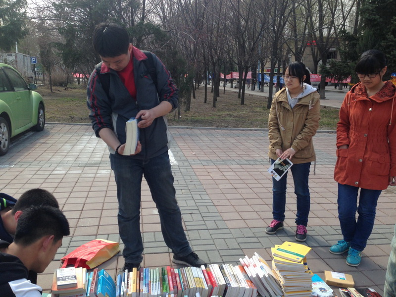 12日13点,同学们带来了来自即将毕业的学长学姐们捐赠的书籍,将它们分门别类的摆好,开始了为期一天半的义卖活动。