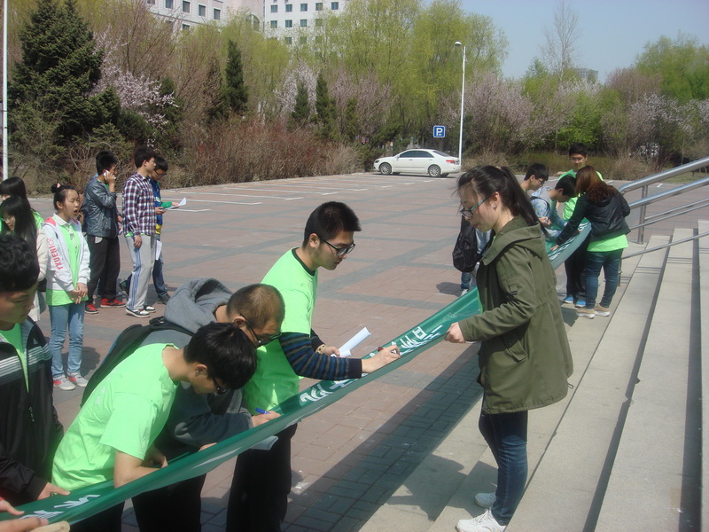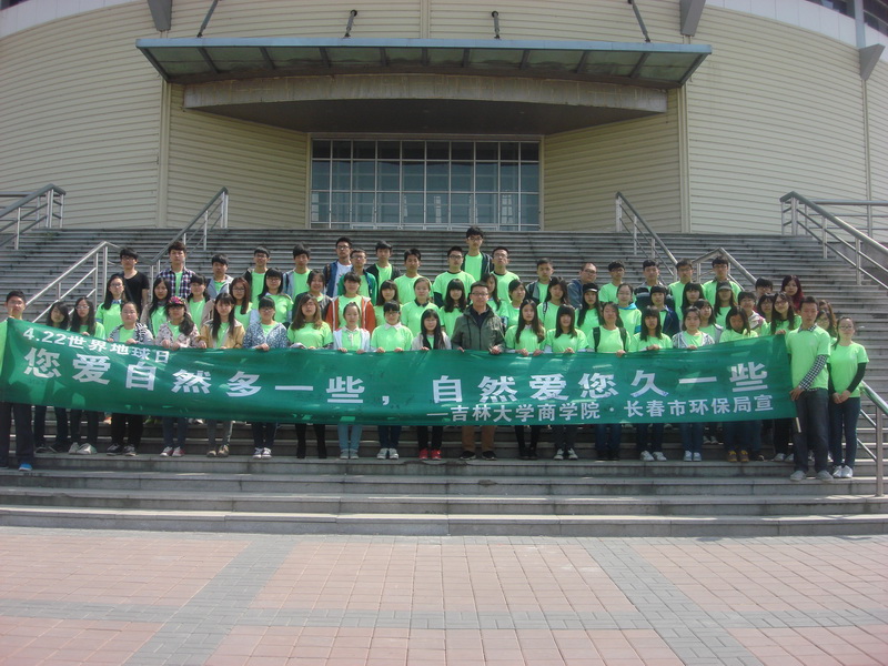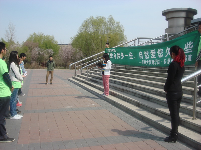 4月19日12点半,为了迎接即将到来的世界地球日,商学院社联工作部和长春市环保局于体育馆北门联合举办了4.22地球日“您爱自然多一些,自然爱你久一些”的活动。参加活动的有商学院学生会主席周浩和全体志愿者。