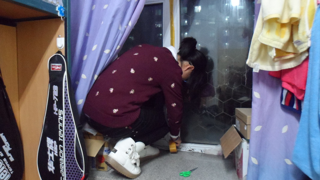 晚8点30分,生活部的同学按时在南苑四舍门口集合后,分为多组,带好事先准备好的剪刀和胶带等工具依次到达指定的宿舍进行封窗。进入寝室后,生活部的同学们热情的与寝室同学聊天,并充分征求宿舍里同学的意见,而后决定是否进行封窗户。这充分体现了商学院自由随和的风气,对同学的关怀细致入微,分外体贴。随后,开始封窗,组内同学之间配合默契,动作敏捷,不怕脏,不怕苦,乐于奉献,毫无怨言。有的同学一边干活一边与寝室同学话家常,与他们讨论生活中遇到的问题,积极征求同学们在生活方面的意见,其乐融融,洋溢着幸福的味道。封窗结束后,生活部的同学仔细检查了每一个寝室,从一楼到二楼,确定没有遗漏掉的寝室后才放心的结束了此次封窗御寒活动。