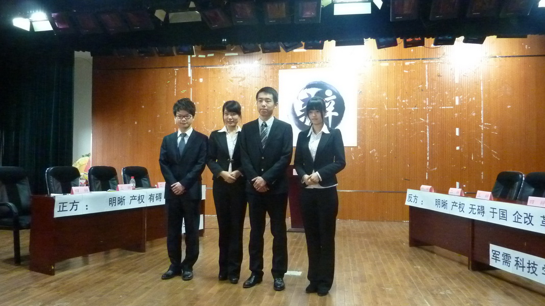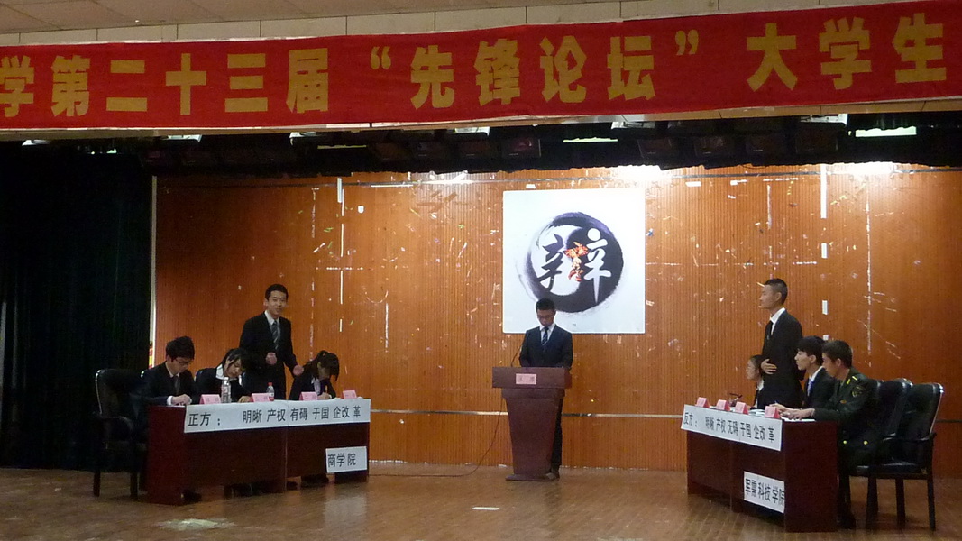 在主席的简短陈辞后,双方进入一辩立论环节。立论中,商学院认为明晰产权对于国企改革实际上是方法上的本末倒置和本质上的背道而驰,从而得到前者会妨碍国企改革发展的观点;而军需科技学院则引出科斯理论,即效率与初始财产权所属无关从而得出明晰产权不妨碍国企改革的观点。