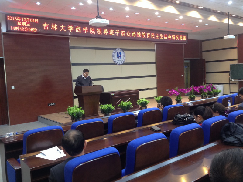 2013年12月4日下午14:30,商学院党委在东荣大厦B310会议室召开领导班子群众路线教育专题民主生活会情况通报大会。商学院、数量经济研究中心领导班子成员、近期退出班子的老领导、院长助理、教学、学术及学位评定委员会主任、各系主任、副主任、支部书记、教代会常设主席团成员、全体行政干部及部分学生代表出席会议听取了情况通报。会议由党委书记蔡志刚同志主持。