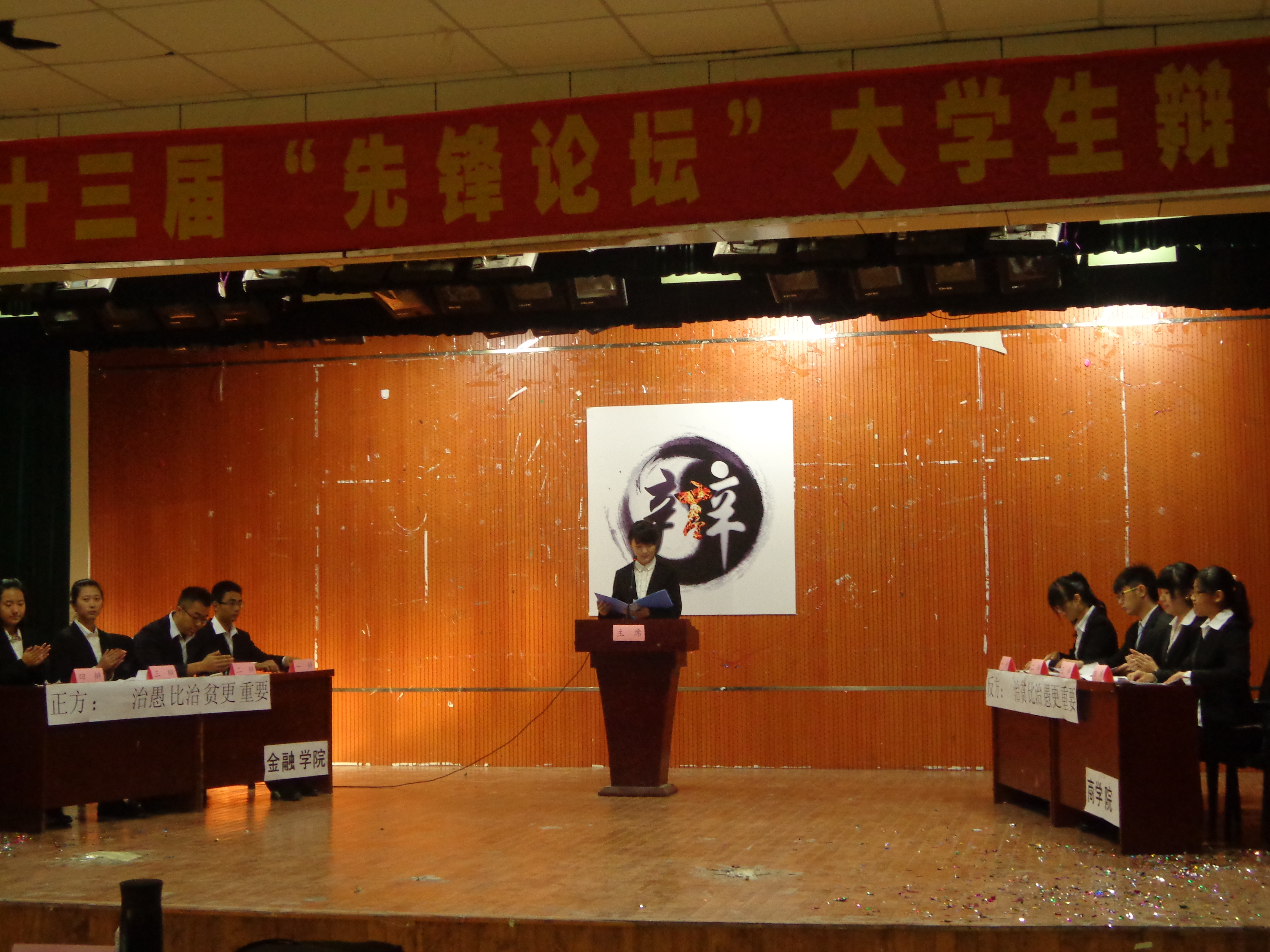 辩论是一门艺术,它体现了一个人的气质和修养也在另一方面体现了语言的魅力和神奇;辩论是一门学问,它不仅仅是嘴皮子上的功夫,更体现了一个人的思辨能力和逻辑推理能力。先锋论坛其实不是一场比赛,更像一个舞台,让每个有辩论梦想的人在上面尽情释放。胜不骄,败不馁,只要站在上面,自信满满说出自己的思想就是成功。