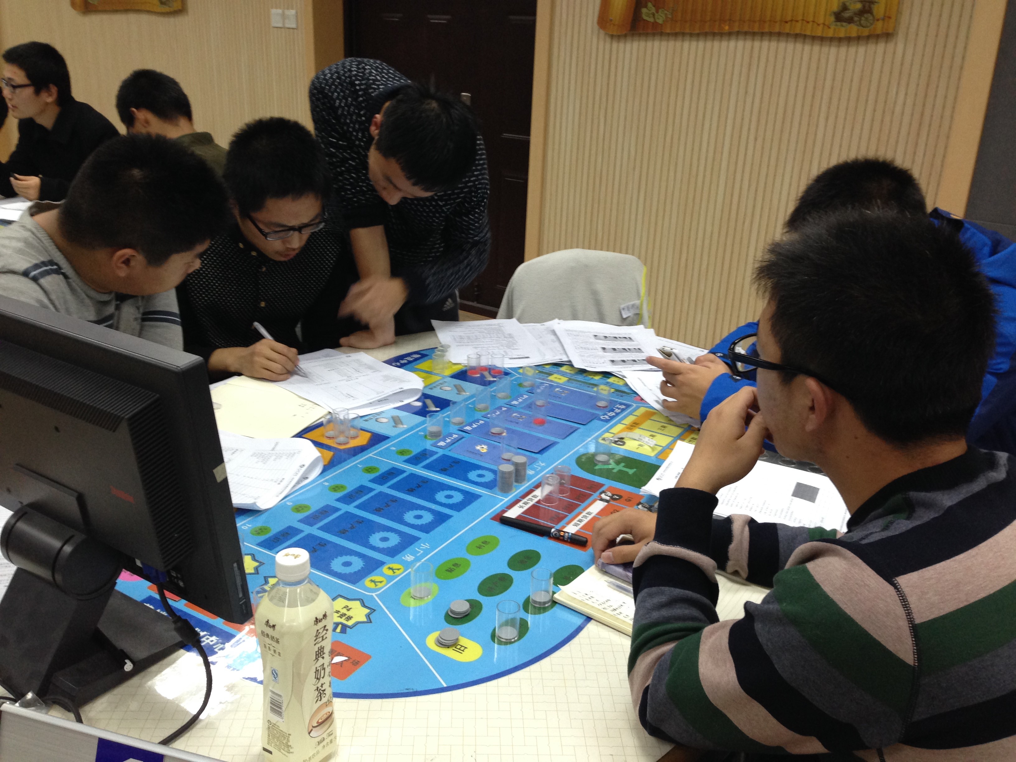 11月10日是比赛的最后一天,也是比赛的最高潮。下定单、开发生产线、开拓市场、取得生产资格认证等等,各小组的“采购总监”穿梭在“银行”和“沙盘”之间,“财务总监”忙于计算资产负债表······大家都在忙碌中为团队贡献着自己的力量。