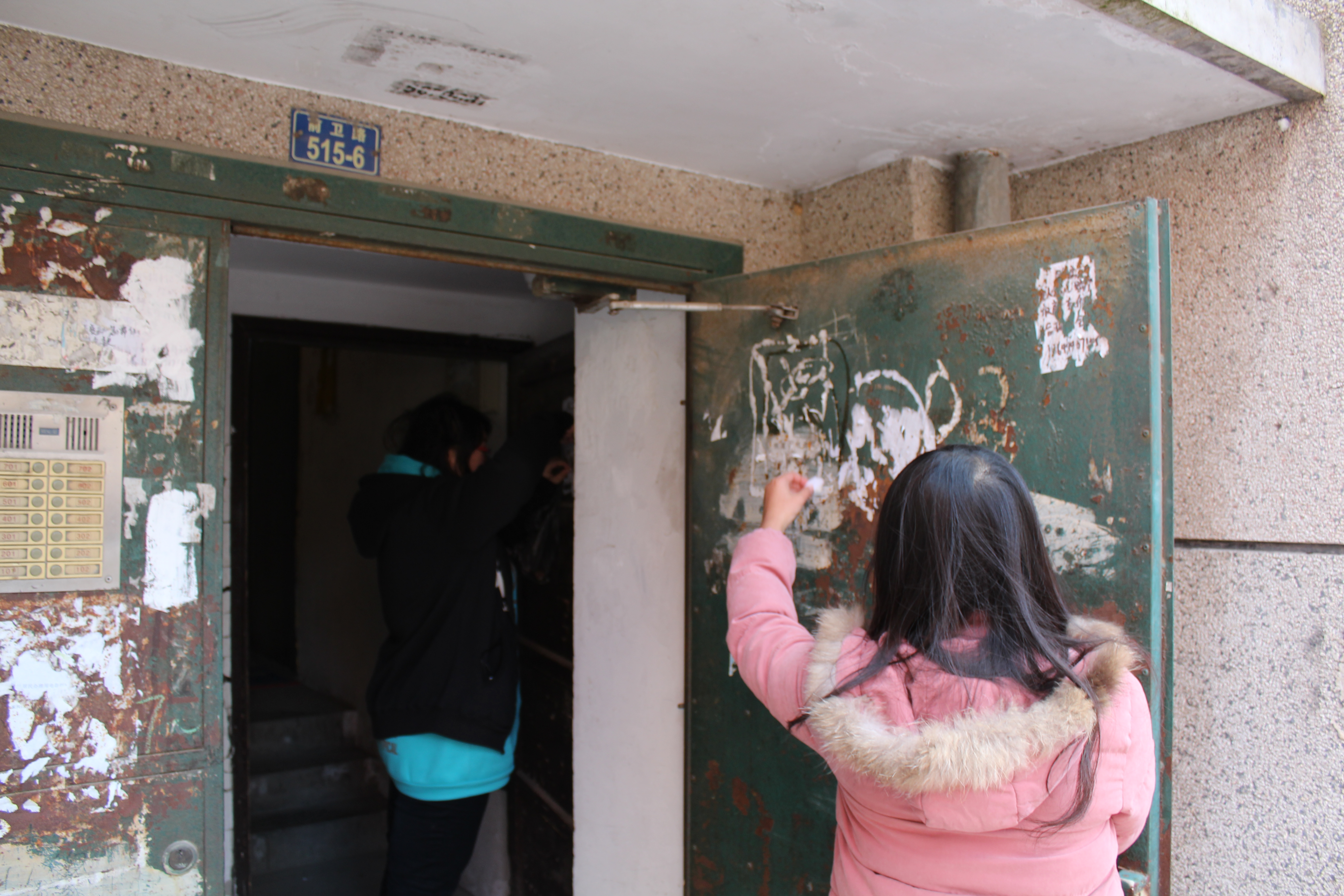 到达小区的楼下,志愿者们每十个人分为一组负责一个单元。每名志愿者都有一个小刀和一个塑料袋,从一楼到七楼,志愿者们逐层清理,不放过任何地方的小广告。整个过程志愿者们都在静静地做自己的事,没有打扰居民们的正常生活。楼道里的小广告有的是很久以前贴的,所以很难清除,不过同学们还是很耐心地一点一点将顽强的小广告撕下。每组志愿者们都清理了三个单元,在此期间,不时有居民上下楼。当他们问及在做什么时,志愿者们都自豪地回答我们是吉大商学院同心志愿者,是来服务居民,清理小广告的,居民们都露出了欣喜的笑容,这时志愿者的心里也美滋滋的。