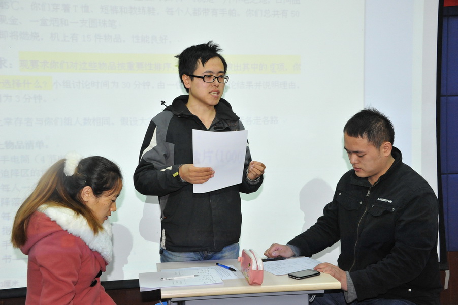 10月17号上午8:30由商学院承办的“无领导小组讨论”的第一场在计算机楼B区108举行,来自商学、计算机、物理、法学等学院的同学参加了本次培训,我院秦晓利副教授亲临现场为同学们讲授无领导小组讨论的相关知识和技巧,并对现场模拟的讨论进行了指导和点评。