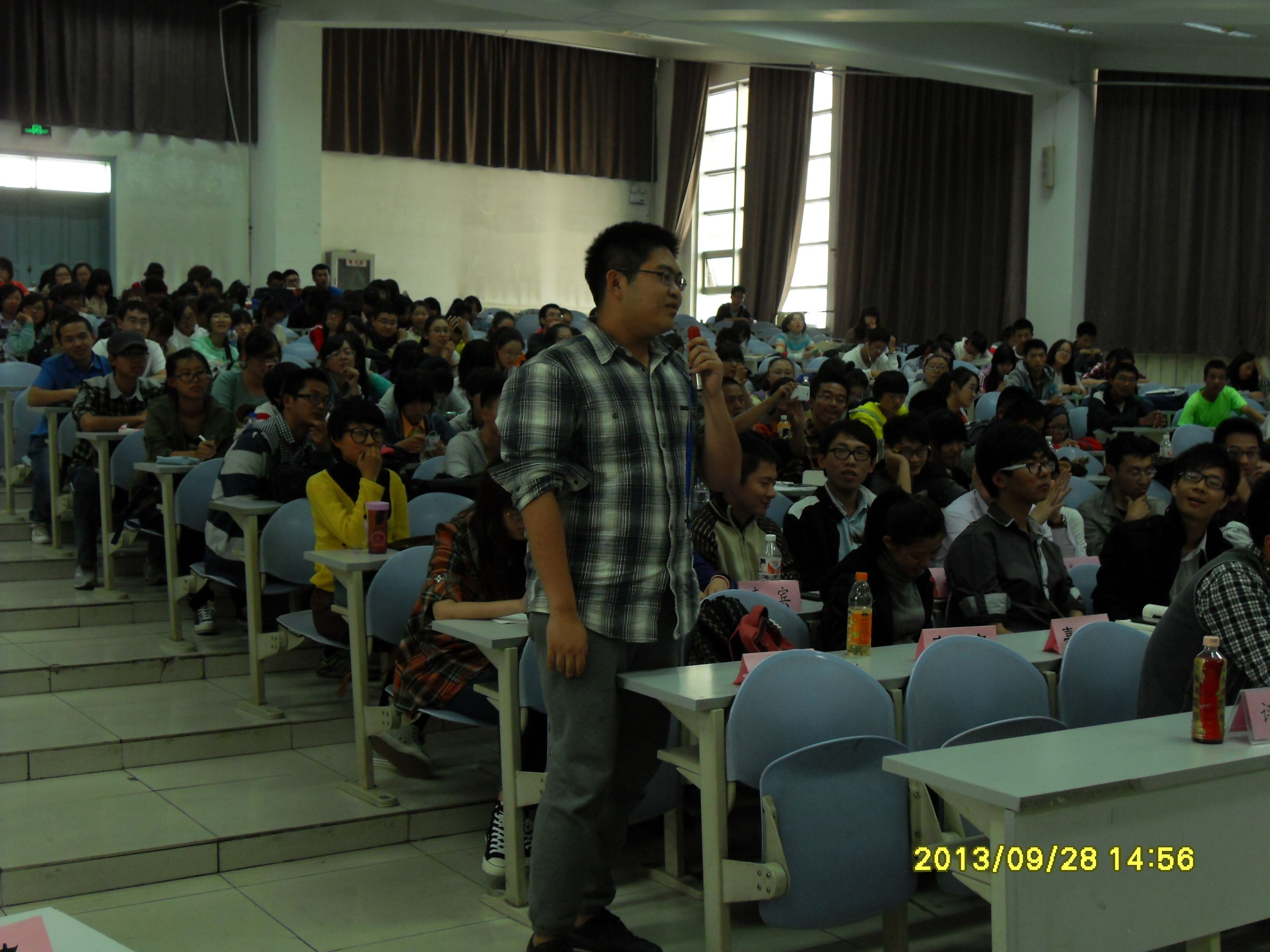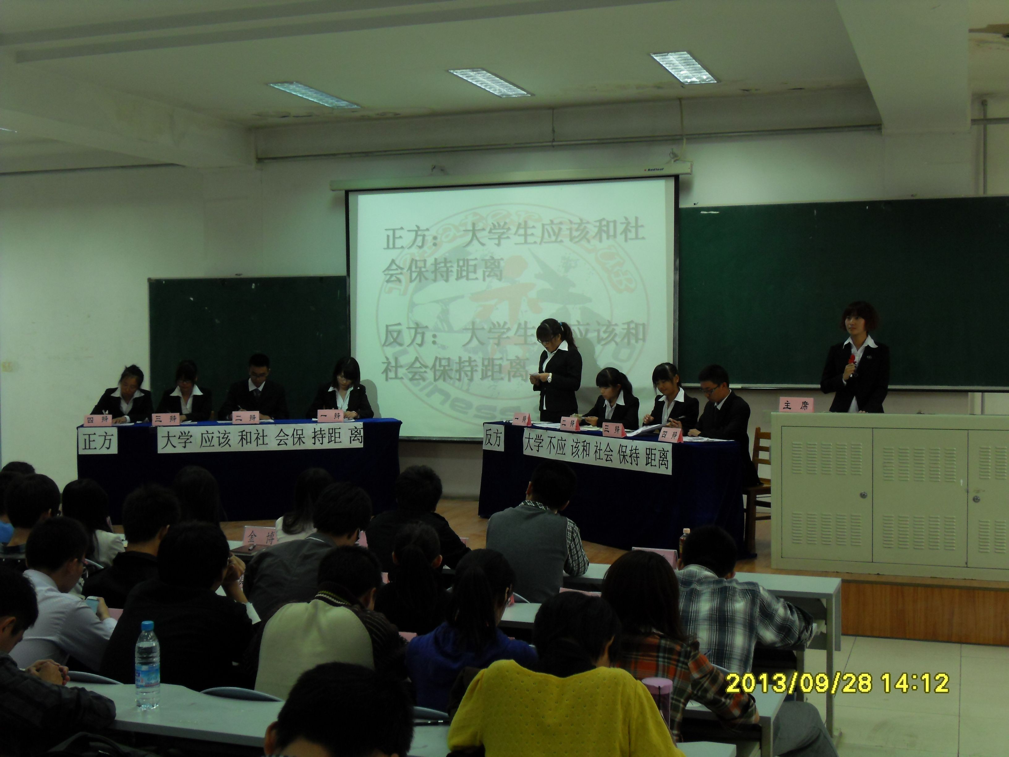 9月28日下午2点,激动人心的商学院2013级新生辩论赛决赛在三教九阶举行。正方会计5班,观点为大学应该和社会保持距离;反方为人力7班,观点为大学不应该和社会保持距离。双方围绕各自论点展开了激烈的角逐。