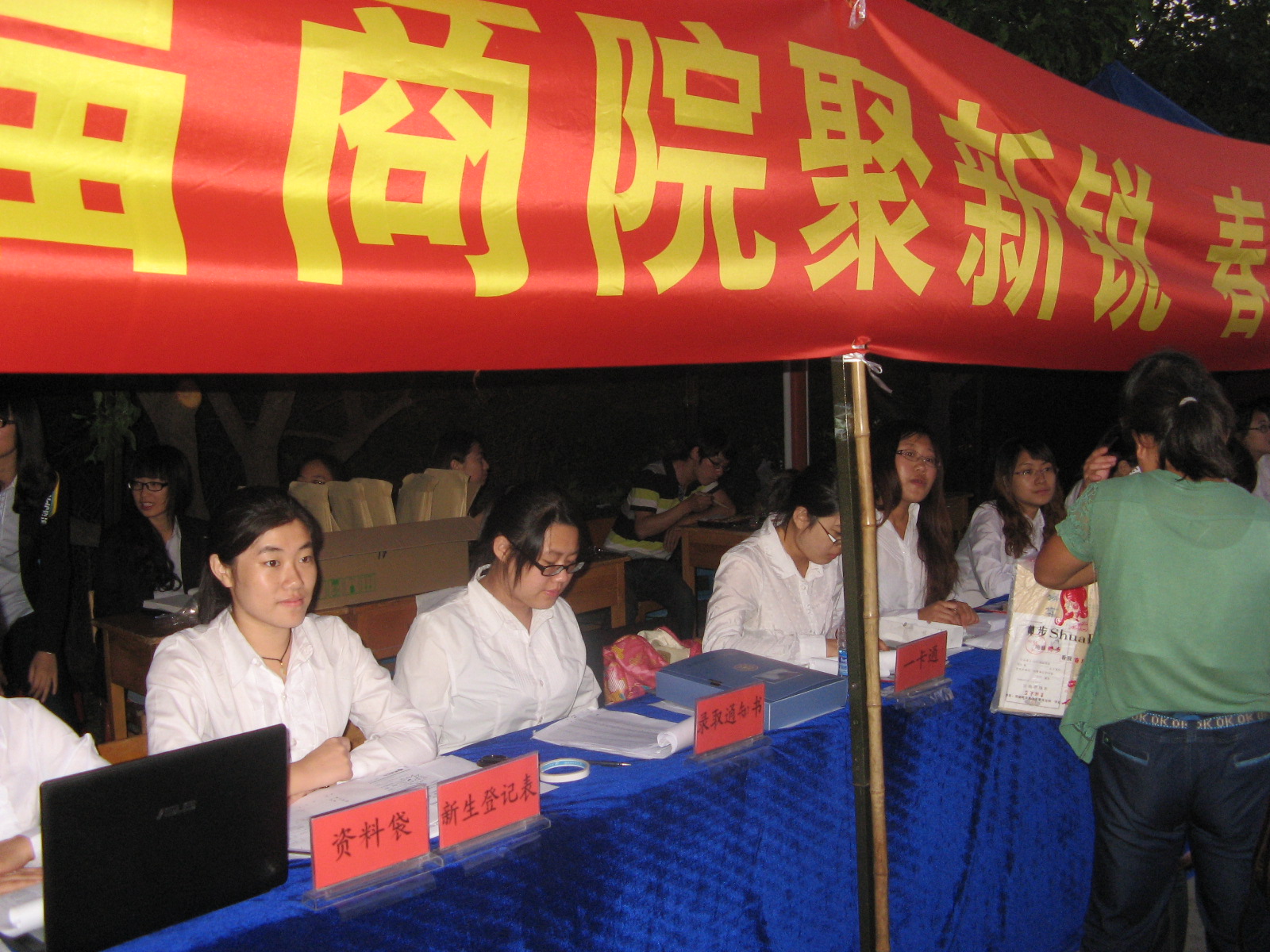 8月23日晚上,经过昨天和今天白天的迎新工作,未报到的人已经寥寥无几。可是,在初秋微冷的夜晚,迎新的工作人员与志愿者们仍然坚守在橘红色的灯光下等候余下新生们的到来。