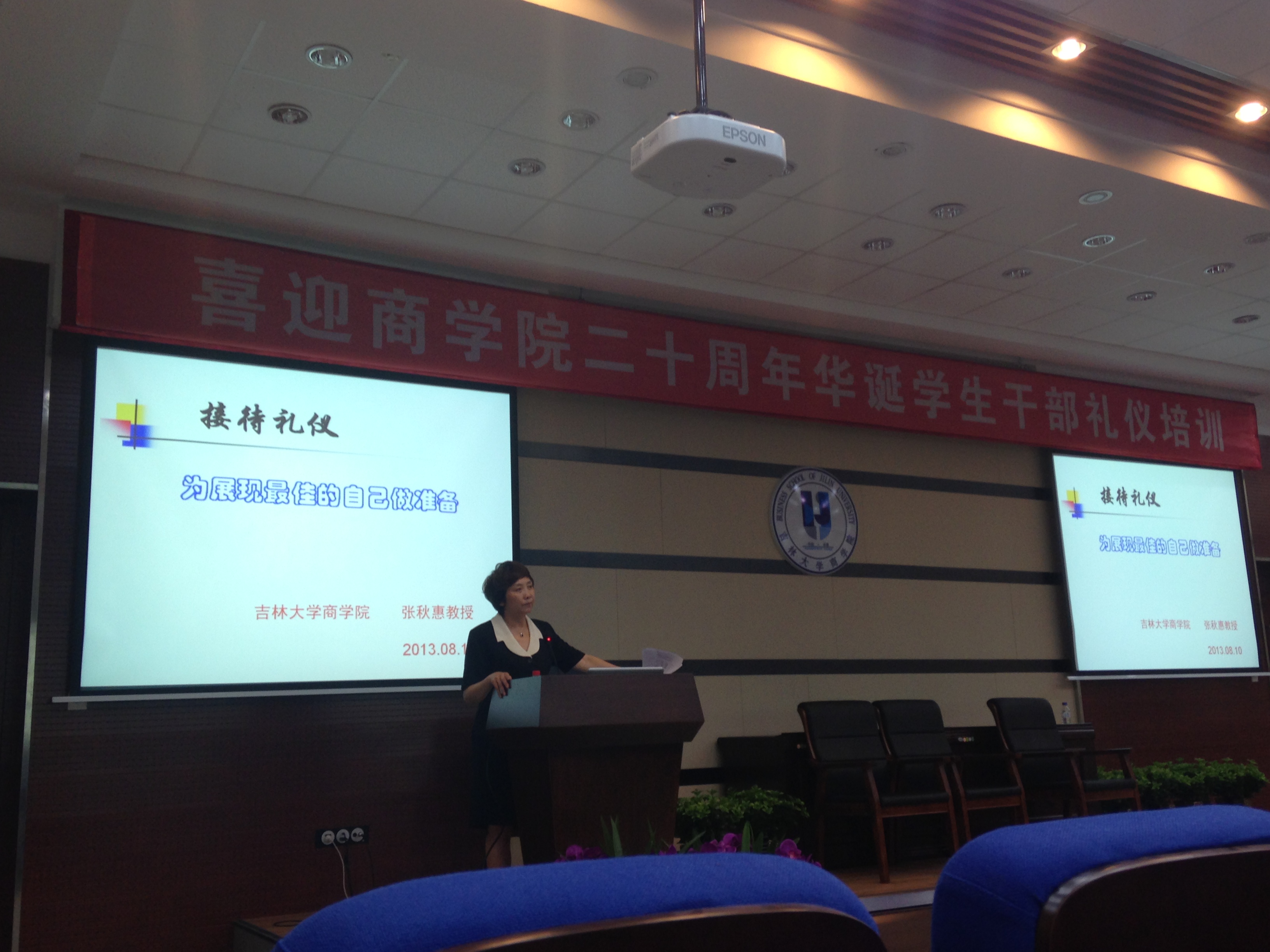 8月10日上午九点,东荣B310的礼仪培训正如火如荼地进行着。本次培训特邀商学院人力资源管理系张秋惠教授担任主讲老师,参加此次培训的有12级辅导员荣诗达老师,以及商学院全体学生干部。张老师以独特的个人魅力和幽默诙谐的语言博得了同学们的阵阵掌声。