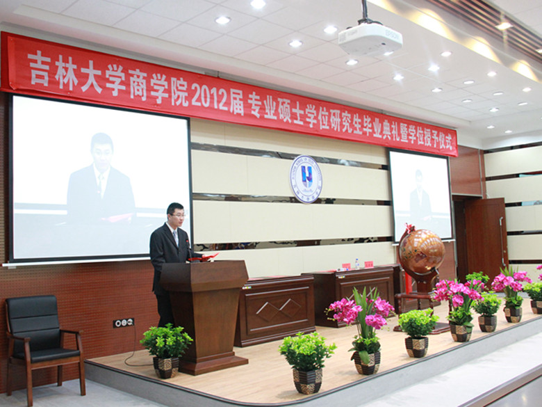 2013年5月12日下午13时30分,商学院2012届专业硕士学位授予仪式暨毕业典礼在吉林大学中心校区东荣大厦B310厅隆重举行。吉林大学商学院院长刘金全教授、商学院党委书记蔡志刚老师、商学院副院长邹国庆教授、商学院副院长金晓彤教授、商学院副院长张世伟教授、商学院副院长刘柏副教授、商学院专业硕士学位委员会主席沈颂东教授、商学院专业学位教育中心招生办主任王世强老师、商学院专业学位教育中心学位办主任李怀日老师莅临了本次典礼。典礼由商学院副院长刘柏副教授主持。
