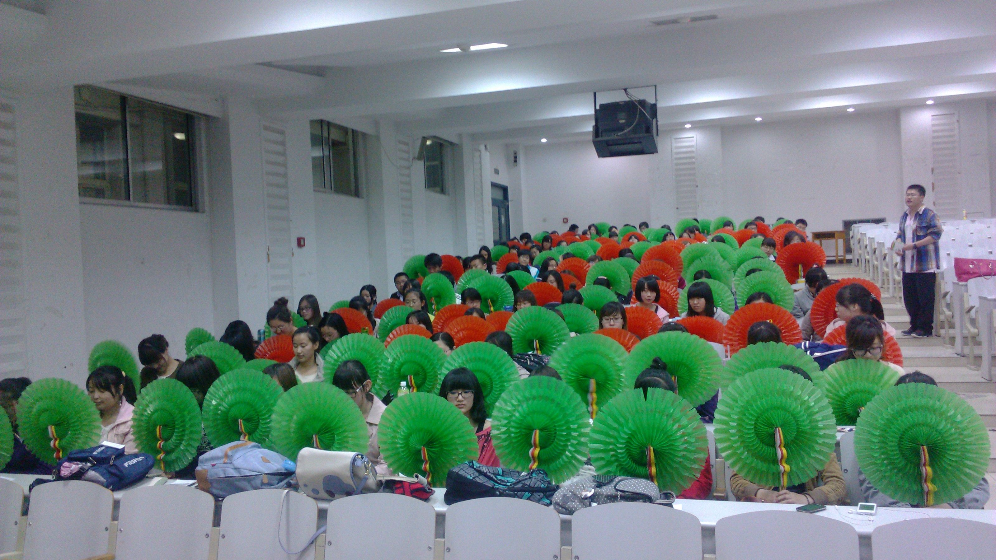 演练之前,首先根据班级顺序进行座位安排,随后为每一位观众发放了观看比赛时的道具——粘有红、黄、绿三种颜色纸片的扇子。演练开始,最先练习简单的翻扇子动作,翻扇子虽然很简单,但动作的整齐划一才是最大的看点,“啪”一声,全场变成一片红色。接着进入了阵型变化的练习,所有观众共同合作摆出复杂的造型。台前鼓点不断,听从指挥,观众摆出“商”字、“加油”字等越来越熟练,兴致也越来越高涨。最后大家一起玩起了翻扇子的人浪,一排一排翻出同样的颜色,接二连三。人浪花样越来越复杂,从前后排翻,斜排翻,到四周往中间翻,左右同时翻,不断考验着同学们的创意与热情。