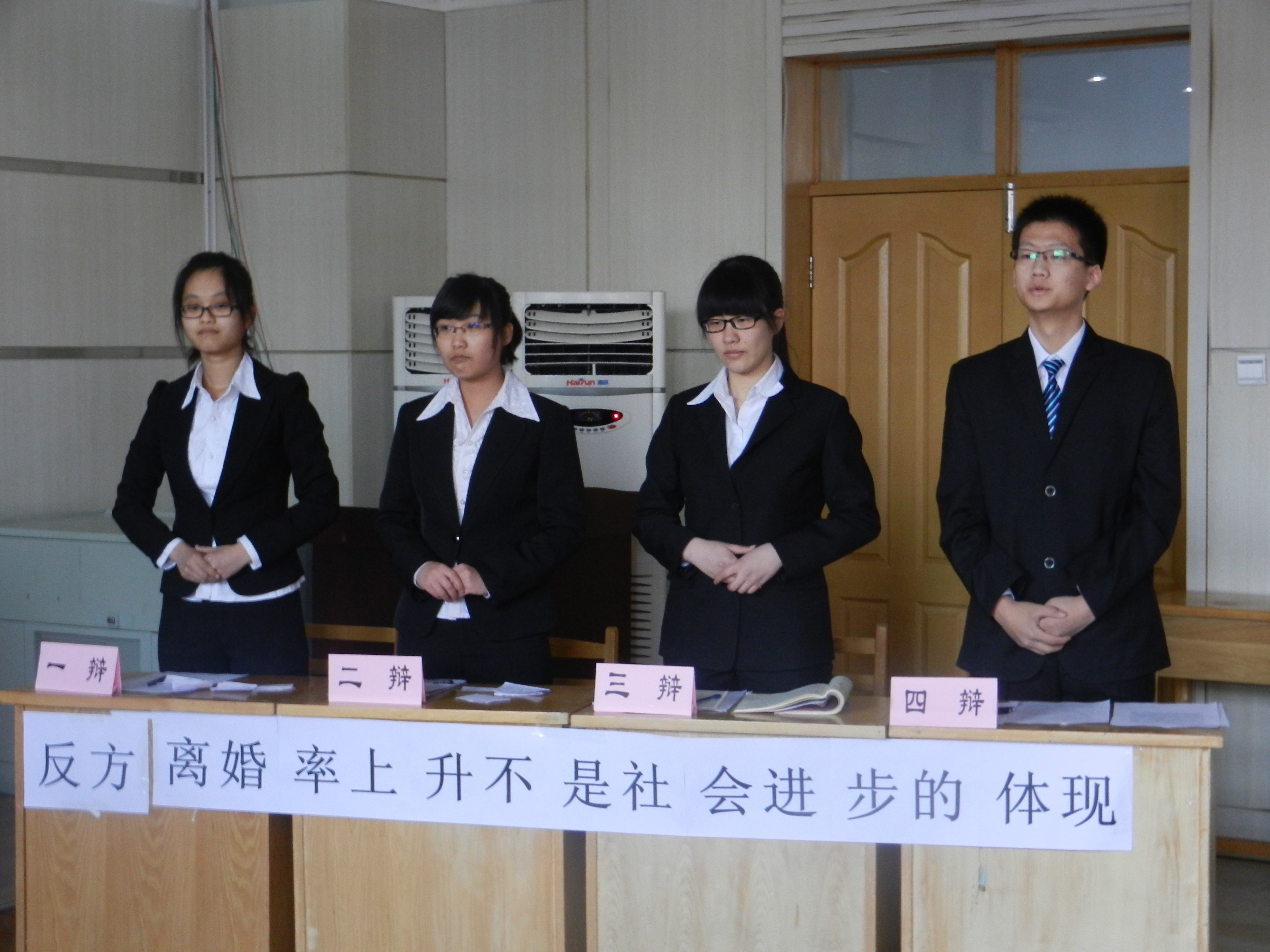 本次友谊赛正方化学院的观点为“离婚率上升是社会进步的体现”,反方商学院的观点为“离婚率上升不是社会进步的体现”。