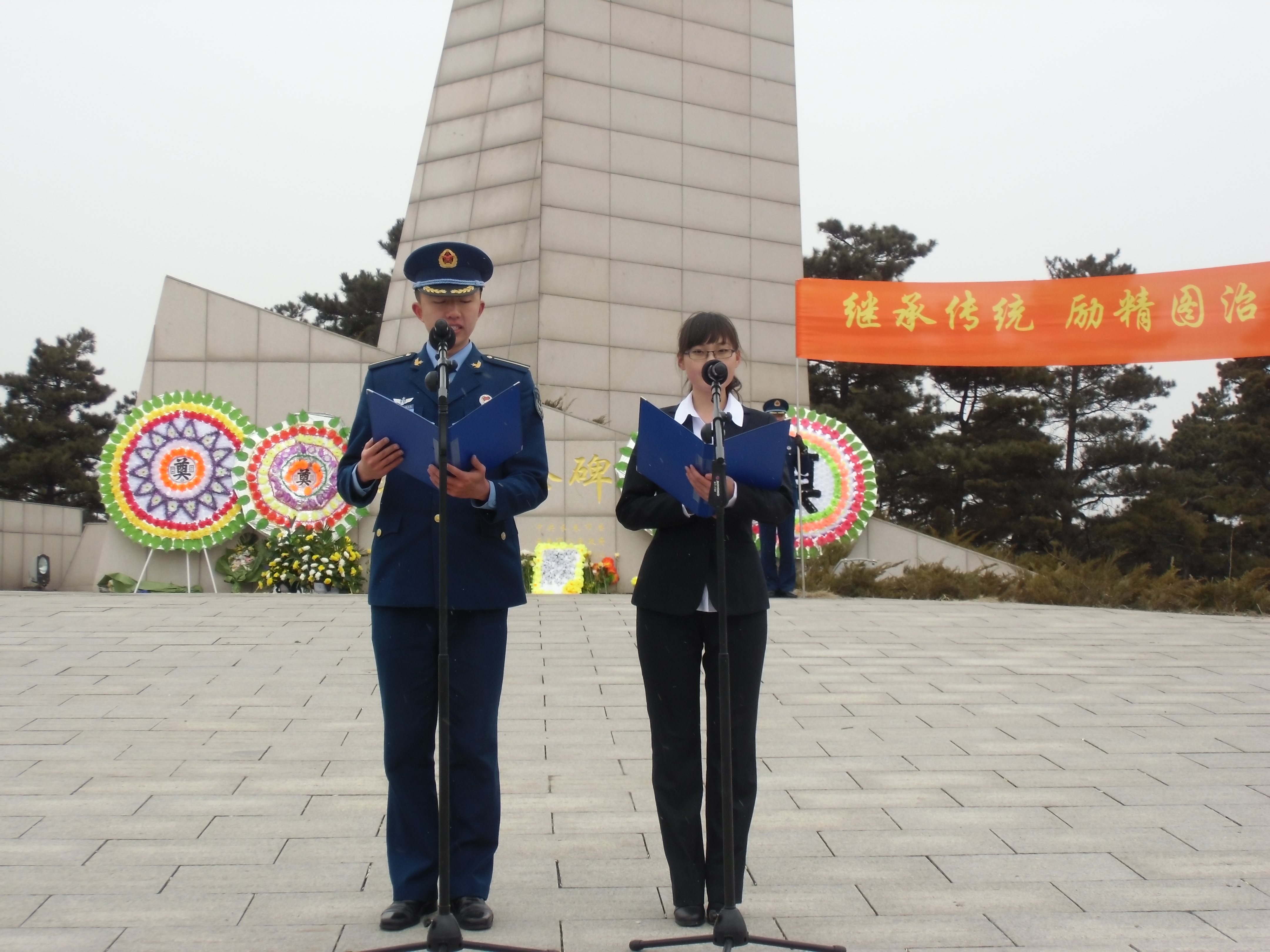 继而是与空军训练基地的学生们一起举行的扫墓仪式。首先,由主持人商学院11级信用管理班支书赵一桐及空军学校代表宣布扫墓仪式开始。接下来由商院学生代表11级营销班支书吴昱潼和空军代表发言,倡议同学们不忘先烈,沿着先辈的足迹,肩负起历史的责任。此时的天空已雪花弥漫,风儿仿佛也呜咽着,为这些伟大的英烈们奏响赞歌。学生代表领誓,众人在这高耸的烈士墓前宣誓:继承先烈遗志,发扬艰苦奋斗精神,为构建社会主义国家而奋斗。宣誓完毕,由仪仗队向众烈士墓敬献花圃,双方学员在条幅上签字立誓。在这个曾经弥漫过熊熊战火的天空下,我们立下不悔的誓言:缅怀先烈,奋发图强,扬我中华国威;继承传统,励精图强,展我中华底蕴。
