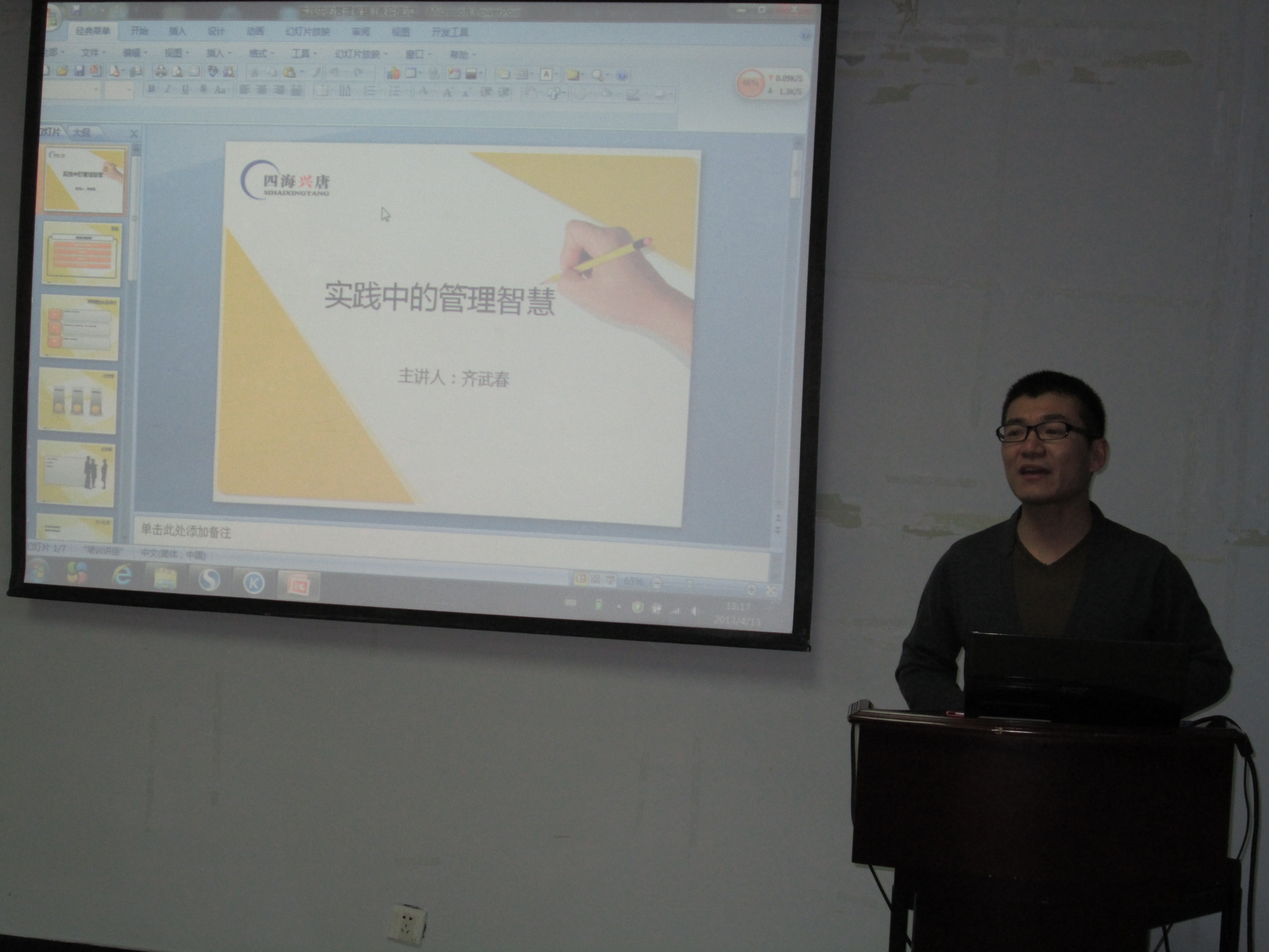 首先,齐老师就人手、人才、人物三者的区别及其对公司的重要性进行论述,随后又提出了作为一个企业的leader所应具备的最重要的品质“在信任、平等的基础上,更要具备前瞻力和全局观”。随后马老师提出了四点管理经验—“注重自身的修养”、“设立明确的目标”、“制定合理的计划”、“传输宝贵的经验”,着其中又渗透着“如何制定规范”、“如何根据员工的面部表情判断员工的工作状态”等诸多问题,并且鲜明地提出大公司与小公司成立初期的区别,可谓发人深思。最后,齐老师着重提出一个管理者所应具备的首要精神—乐观主义,并指出如何以自己积极向上的状态感染员工,从而为公司创造更大的效益。