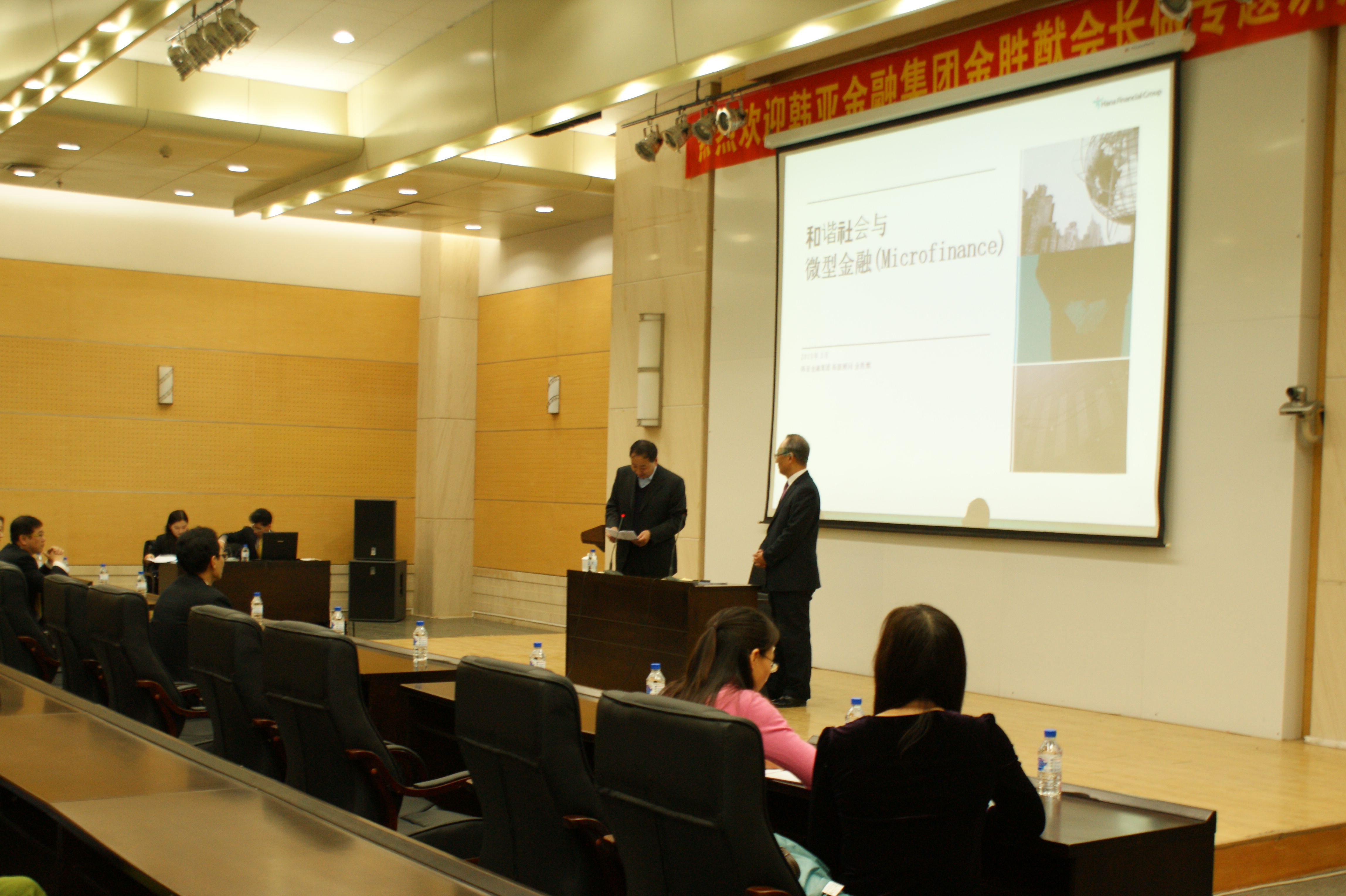 3月12日上午10点,韩亚金融集团金胜猷会长应邀为商学院学子们做题为《和谐社会与微型金融》专题讲座。讲座由商学院院长刘金全主持。