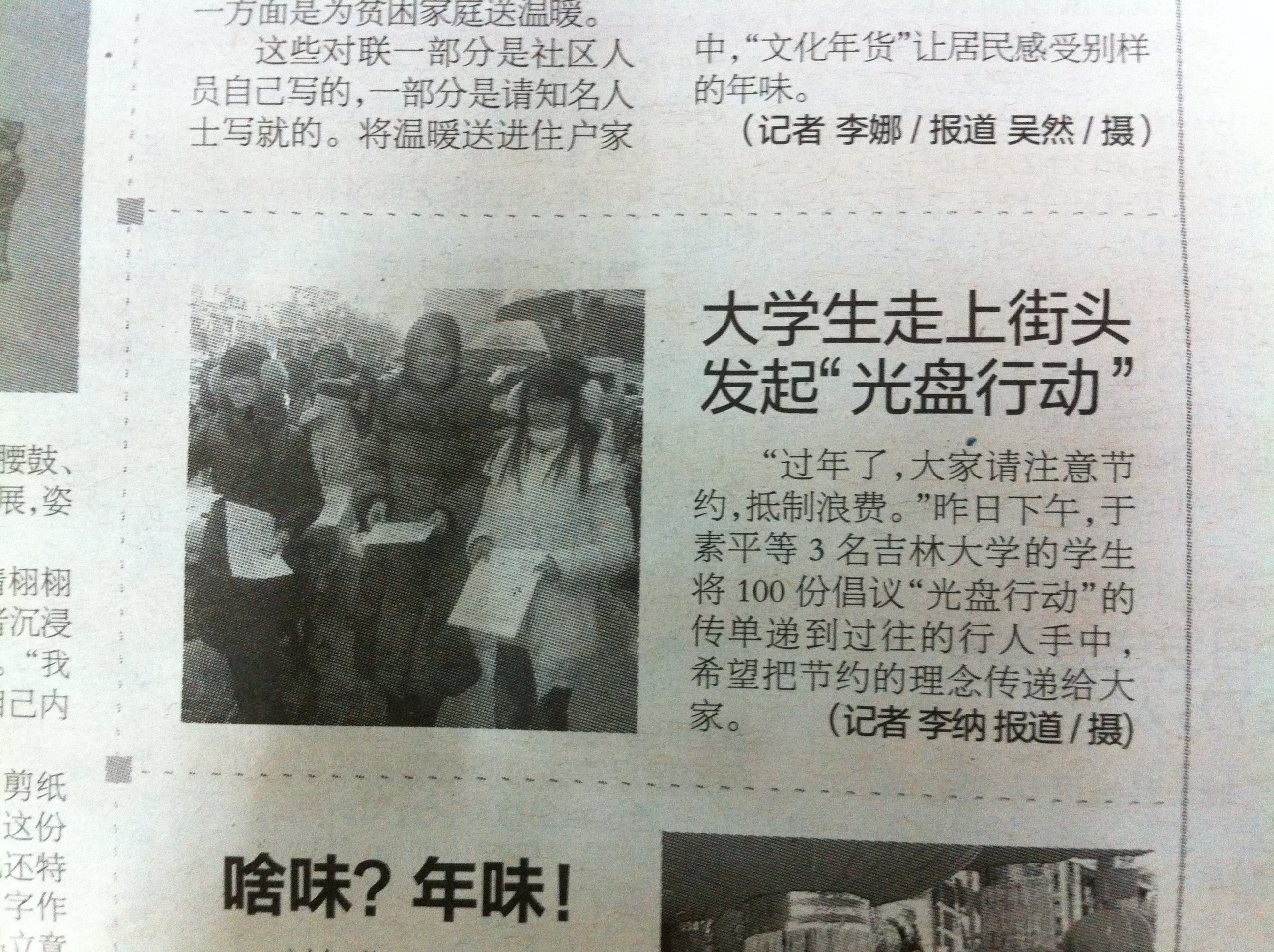 2013年2月7日下午一点商学院11级和12级的几名同学来到长春市桂林路,为“光盘行动”发传单做宣传。“光盘行动”是在2013年1月16日首先由微博认证用户徐侠客(国土资源报副社长)在腾讯微博发起的,他倡导网友珍惜粮食,加入行动。微博一经发布得到蔡奇、王郁松等腾讯名人和人民日报、国土资源报等媒体的支持,1月22日《新闻联播》报道该活动,号召大家节约粮食、从我做起。随后一场轰轰烈烈的“光盘行动“在全国普及开来。