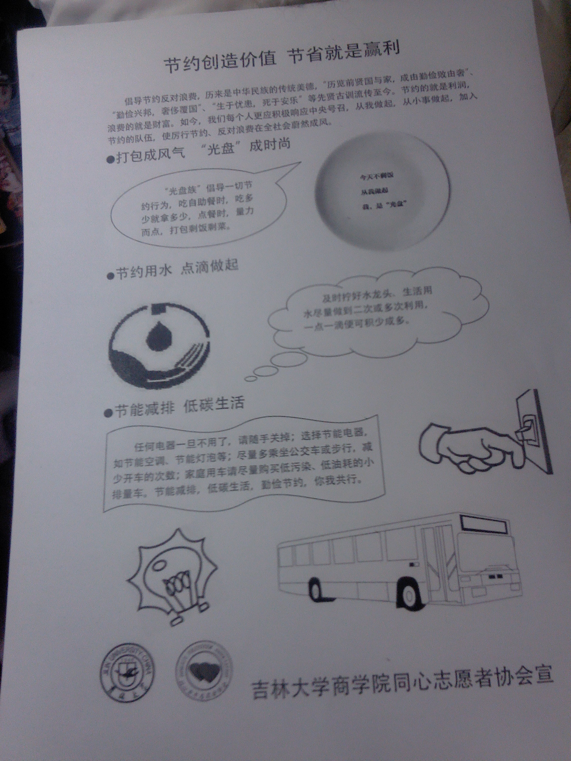 “浪费可耻,节约光荣”是众人皆知的一句话,可是在平时生活中,我们在家或者外出就餐时,迫于种种原因,最后饭桌上总会剩下一堆食物,结果不外乎是倒掉,甚少有人会想着去打包。所以为了使大家能够更加自觉地合理点餐,养成剩余打包,勤俭节约的良好生活习惯,商学院同学自己制作并印发了以“节约创造价值,节省就是盈利”为题目的宣传单,宣传单分为打包成风气,“光盘”成时尚;节约用水,点滴做起;节能减排,低碳生活三个部分。几名同学站在寒风中将这些传单分发给过路的行人,并向他们宣传节俭的重要性,一个下午的时间,同学们分发了上百份的传单。虽然冻得瑟瑟发抖但同学们真正感受到了做为志愿者的欢乐和收获。