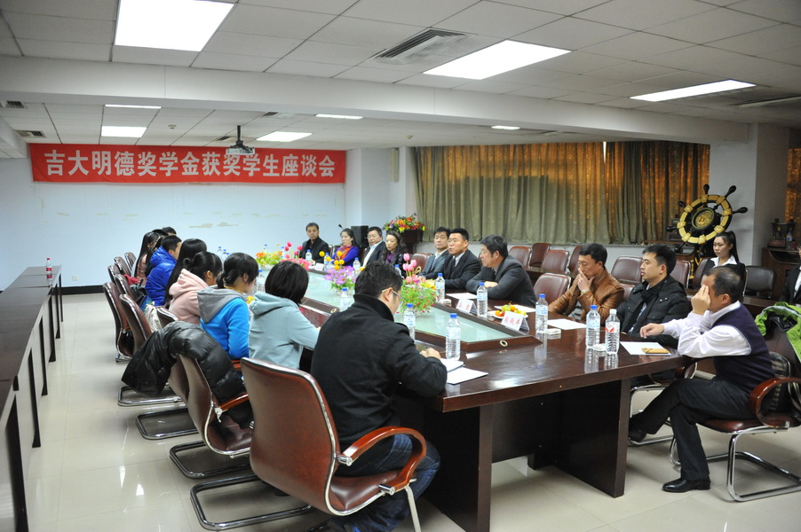 11月1日下午3时,商学院于东荣大厦304会议室举行了“吉大明德奖学金获奖学生座谈会”。吉林吉大明德投资有限公司副董事长、总经理李东升先生,吉林省北科通信器材有限公司董事长王秋彦女士,吉林省西点药业科技发展股份有限公司副总经理孙凯先生,上海绿地集团吉林置业有限公司总经理张铁丰先生,吉大明德投资有限公司财务总监陈晶女士,吉林大学学生工作部部长周春国老师,吉林大学教育基金会主任安泽老师、副主任冉军老师出席了本次座谈会。同时出席本次活动的学院领导有:商学院党委书记蔡志刚老师和党委副书记兼副院长范庆文老师。范书记主持了本次活动。
