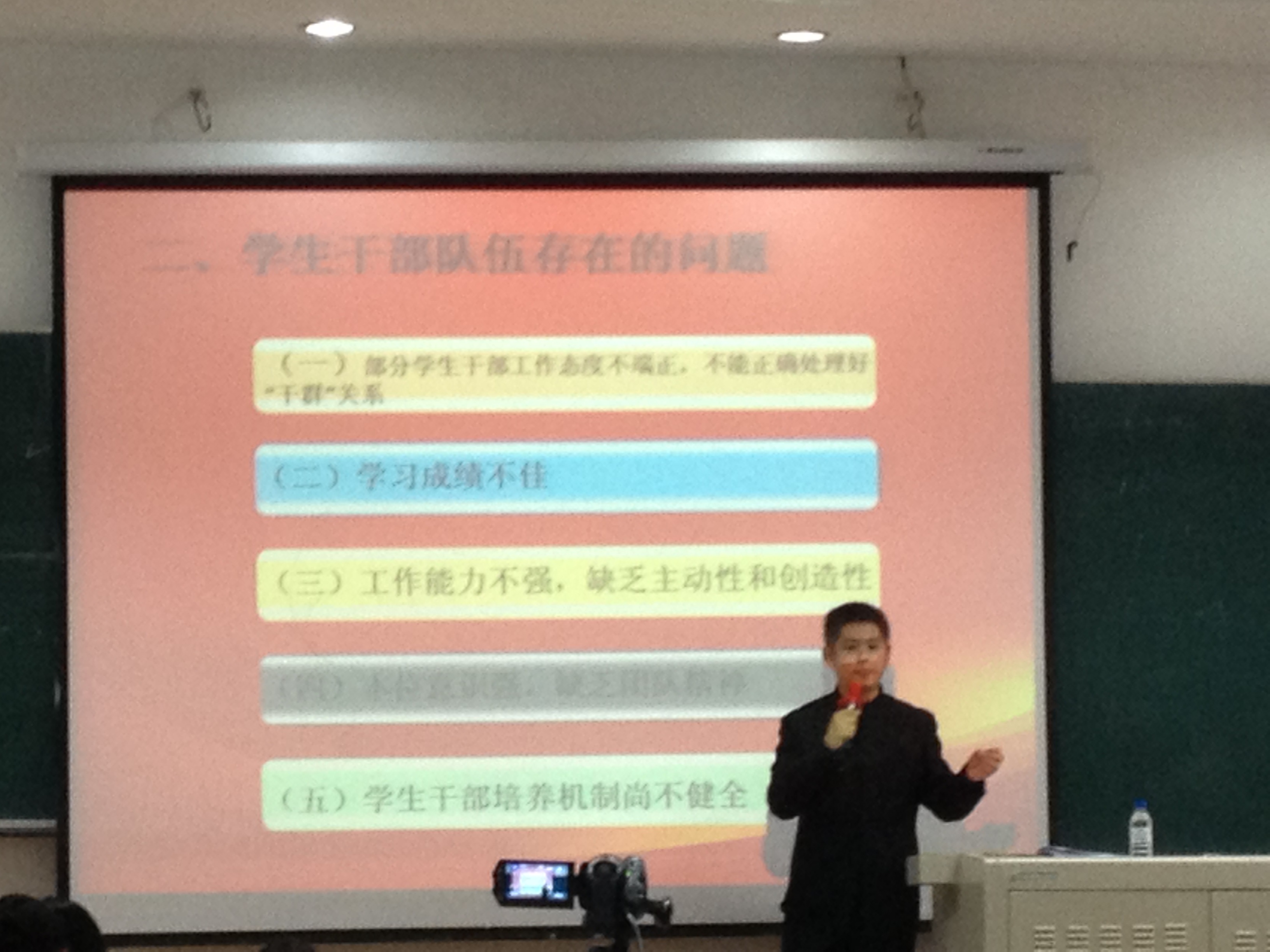 高岩老师表示:此次活动是为了响应十八大的号召,传授给同学们在新时期下作为合格大学生,尤其是学生干部应该具有的素质和心态。活动的意义不仅在于提高同学们的工作能力,更重要的是提升大家的思想深度和提高自身的素质和品质。高岩老师在讲话中回忆了自已作为学生干部和成为导员之后亲身经历的一些有特点的学生干部的工作方法,让大家感受颇深。并且要求同学们在生活的一点一滴中养成良好的品质,逐步提高自己的思想深度,提高自身修养,展现当代大学生良好风貌,无愧于学生干部的职务。