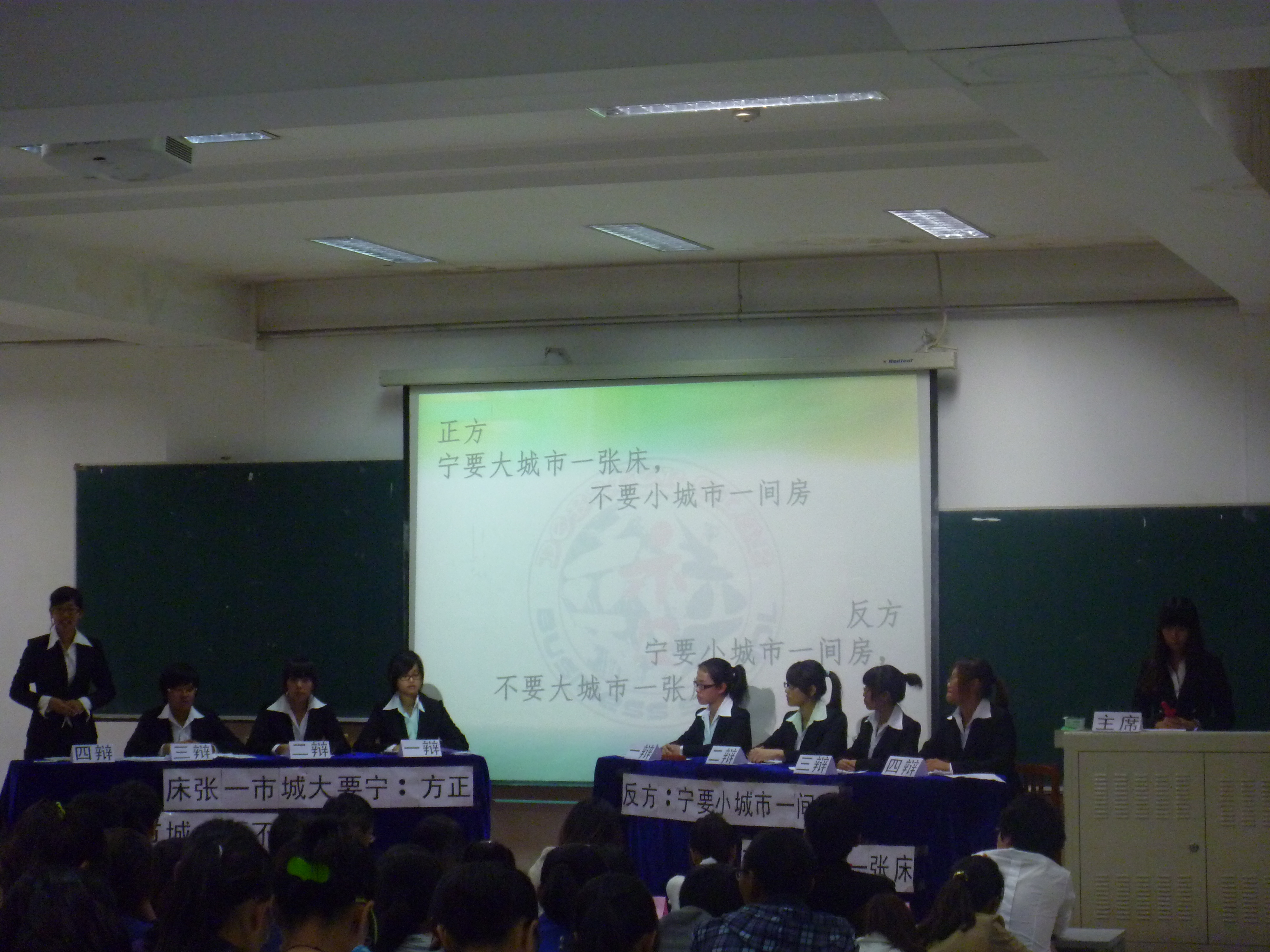 本次辩论正方为信用管理班,他们的观点是“宁要大城市一张床,不要小城市一间房”;反方是会计学四班,他们的观点是“宁要小城市一间房,不要大城市一张床”。