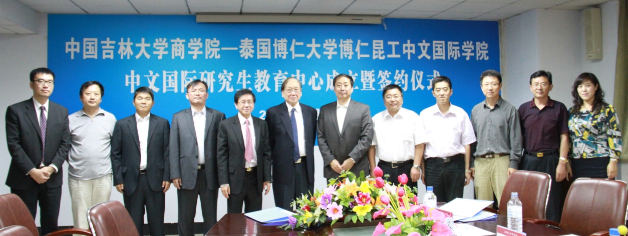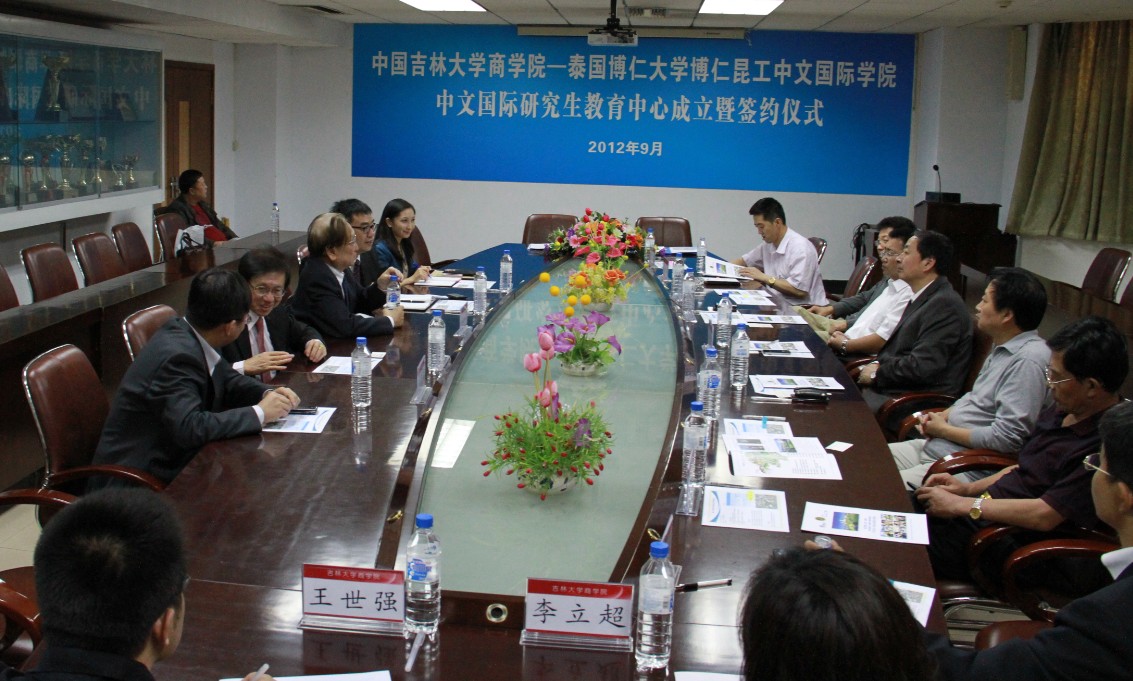 2012年9月5日下午13:00时,泰国博仁大学名誉校长Prof.Boonserm Weesakul,博仁大学博仁昆工中国国际学院院长丁钟贤、行政副院长刘莹莹、秘书王道明一行访问了吉林大学商学院。商学院院长刘金全,党委书记蔡志刚,副院长沈颂东、庞晓波、邹国庆、张世伟、李宝永,副书记李立超及商学院专业学位招生办主任王世强热情接待了博仁大学名誉校长一行。