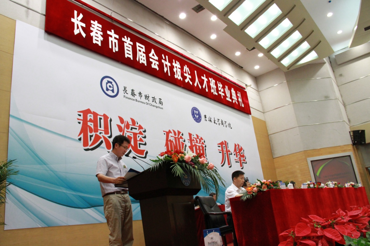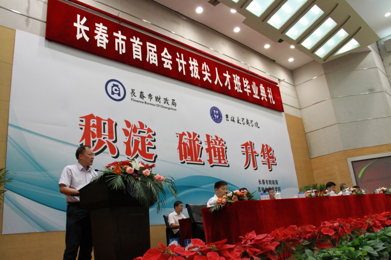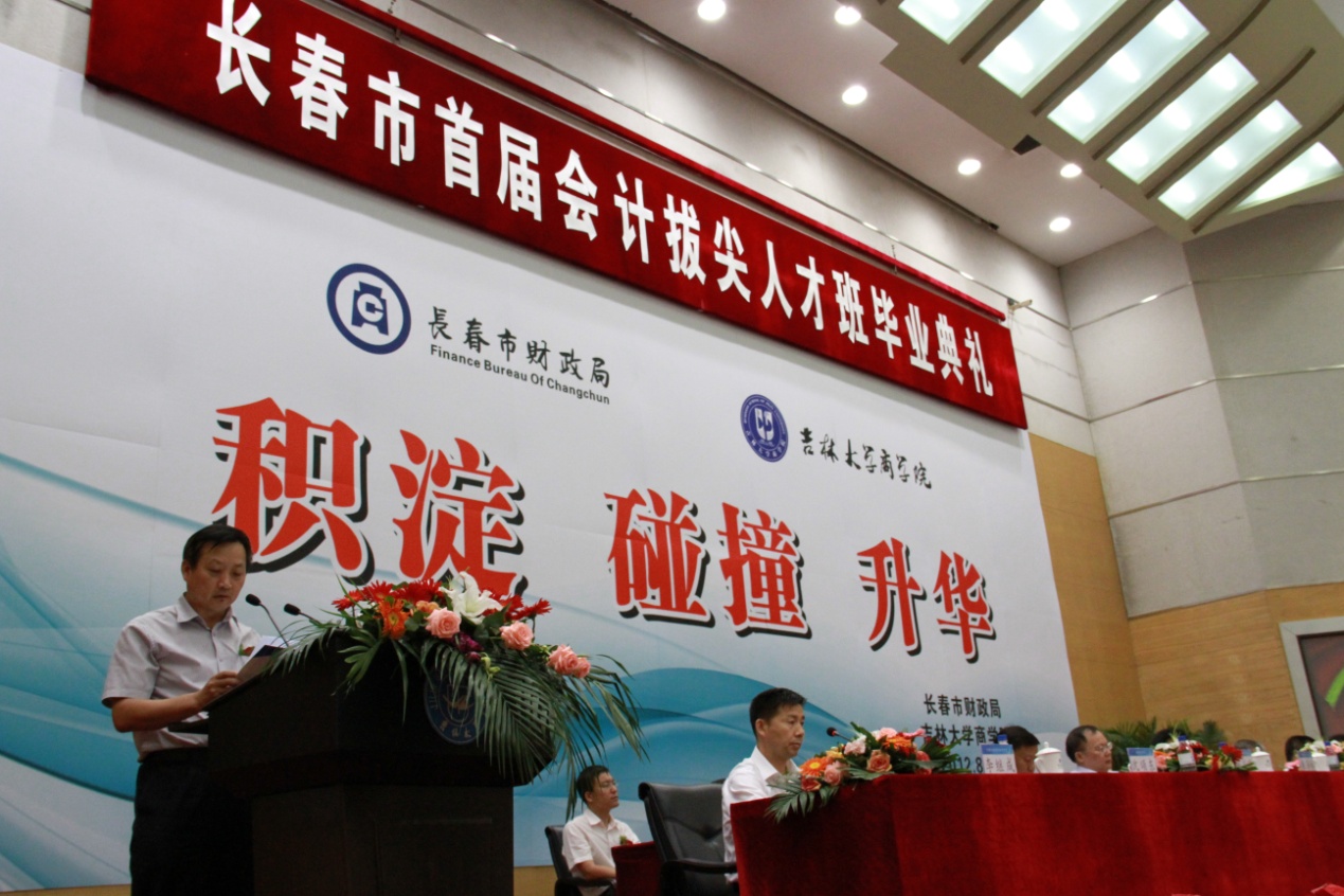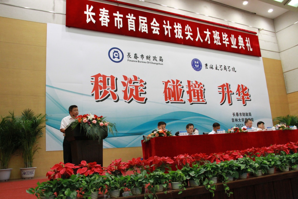 2012年8月10日下午14:00时,长春市首届会计拔尖人才班毕业典礼在吉林大学中心校区东荣会议中心一楼报告厅隆重举行。财政部会计司副司长朱海林、长春市委组织部副部长张宝琦、省财政厅总会计师周仁杰、长春市财政局局长胡延生、吉林大学商学院党委书记蔡志刚、吉林大学商学院副院长沈颂东、吉林大学商学院副院长邹国庆、部分学员单位领导代表以及134位长春市首届会计拔尖人才班学员参加了本次典礼。典礼由长春市财政局副巡视员李继成主持。