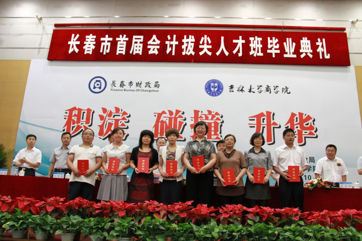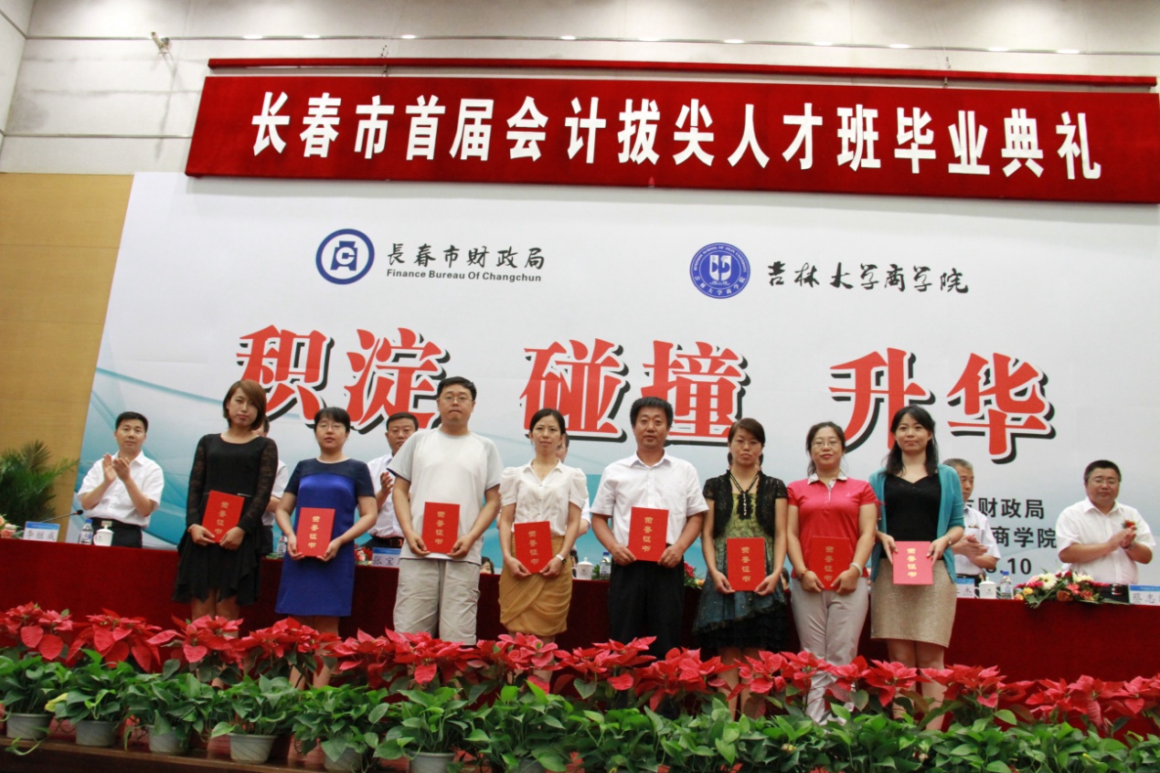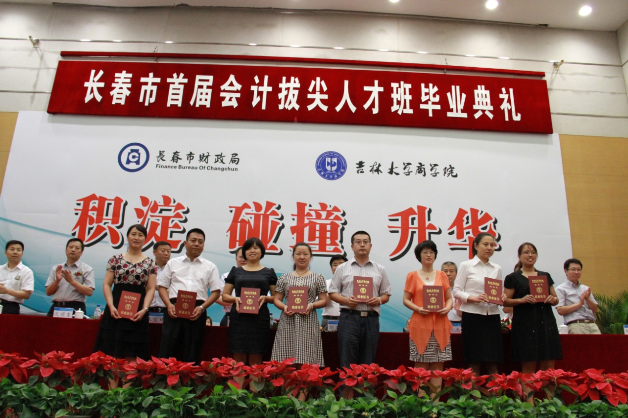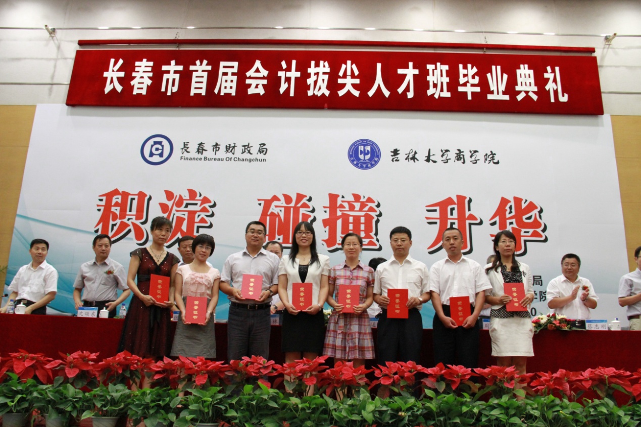 2012年8月10日下午14:00时,长春市首届会计拔尖人才班毕业典礼在吉林大学中心校区东荣会议中心一楼报告厅隆重举行。财政部会计司副司长朱海林、长春市委组织部副部长张宝琦、省财政厅总会计师周仁杰、长春市财政局局长胡延生、吉林大学商学院党委书记蔡志刚、吉林大学商学院副院长沈颂东、吉林大学商学院副院长邹国庆、部分学员单位领导代表以及134位长春市首届会计拔尖人才班学员参加了本次典礼。典礼由长春市财政局副巡视员李继成主持。
