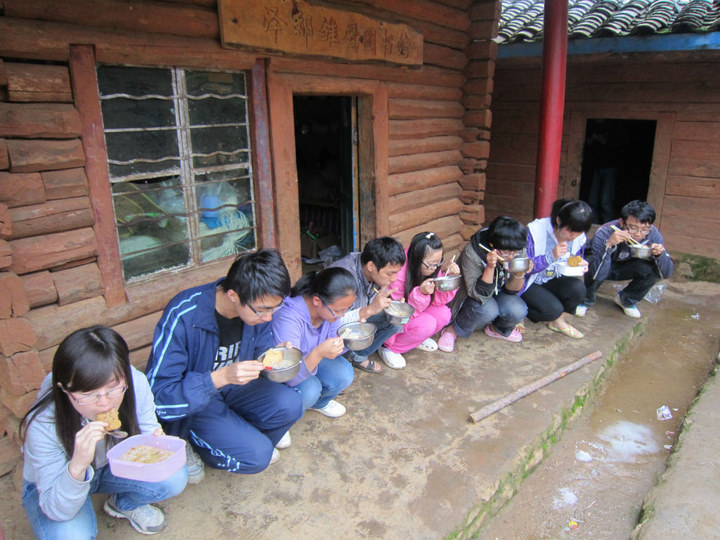 7月14日,是队员们在这里支教的第二天。早上七点,大家准时起床,收好搭在教室里的帐篷,摆好课桌,然后开始上午的教学。因为队员们不敢带很多的菜,更不敢带肉(没有冰箱,保质期是个大难题),所以,队员们每天只能吃一顿饭。到了下午,等到学生们放学了,队员们就要开始生火煮饭炒菜了。这是队员们到这后煮的第二次饭,队员们都太饿了,也顾不上饭熟没熟,大家就狼吞虎咽的吃了起来。孩子们放学之后,队员们就要把教室里的课桌收起来,搭起帐篷,为晚上休息做准备。这里经常下雨,所以队员们就把盆放在操场上接雨水,以备第二天用这些雨水洗漱、洗菜,因为没有工业污染,这里的雨水特别干净。