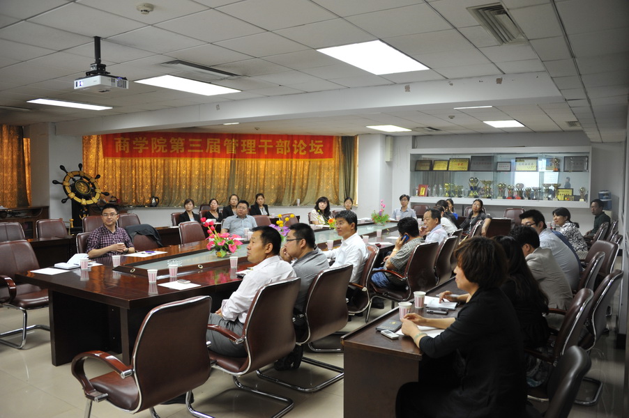 2012年6月15日下午14:30,“商学院第三届管理干部论坛”在东荣大厦306会议室成功举行。商学院党委书记蔡志刚,副院长李宝永,党委副书记李立超出席了本次论坛,全体管理干部和聘任人员也悉数参加。本次论坛由副院长李宝永主持。