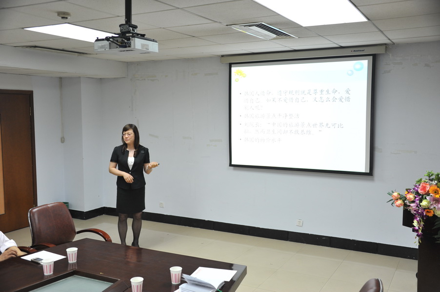 林晶老师首先走上讲台。她从韩国人的工作作风、生活习惯、教育方式以及处事态度展开,细致分析了他们注重严谨和追求品质的文化,对他们时时细致,事事认真的态度给予了高度的认可。林老师总结道:工作上的细节不但能检验态度,更能决定成败,强化服务意识、提升服务质量是每一名管理干部需要不断加强的方面。林老师对韩国高丽大学的校友工作也给予了很高的评价,称值得我们借鉴与学习。