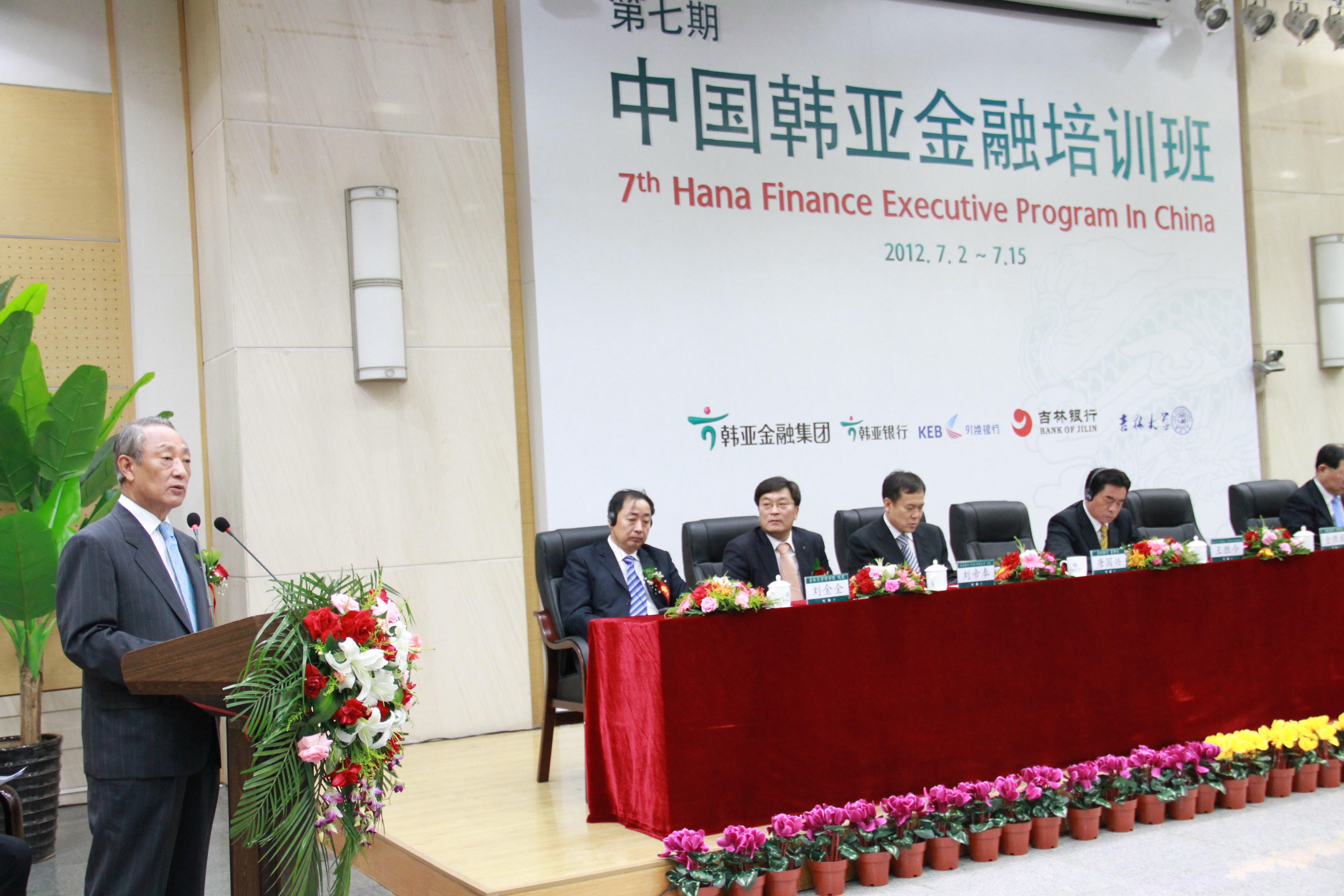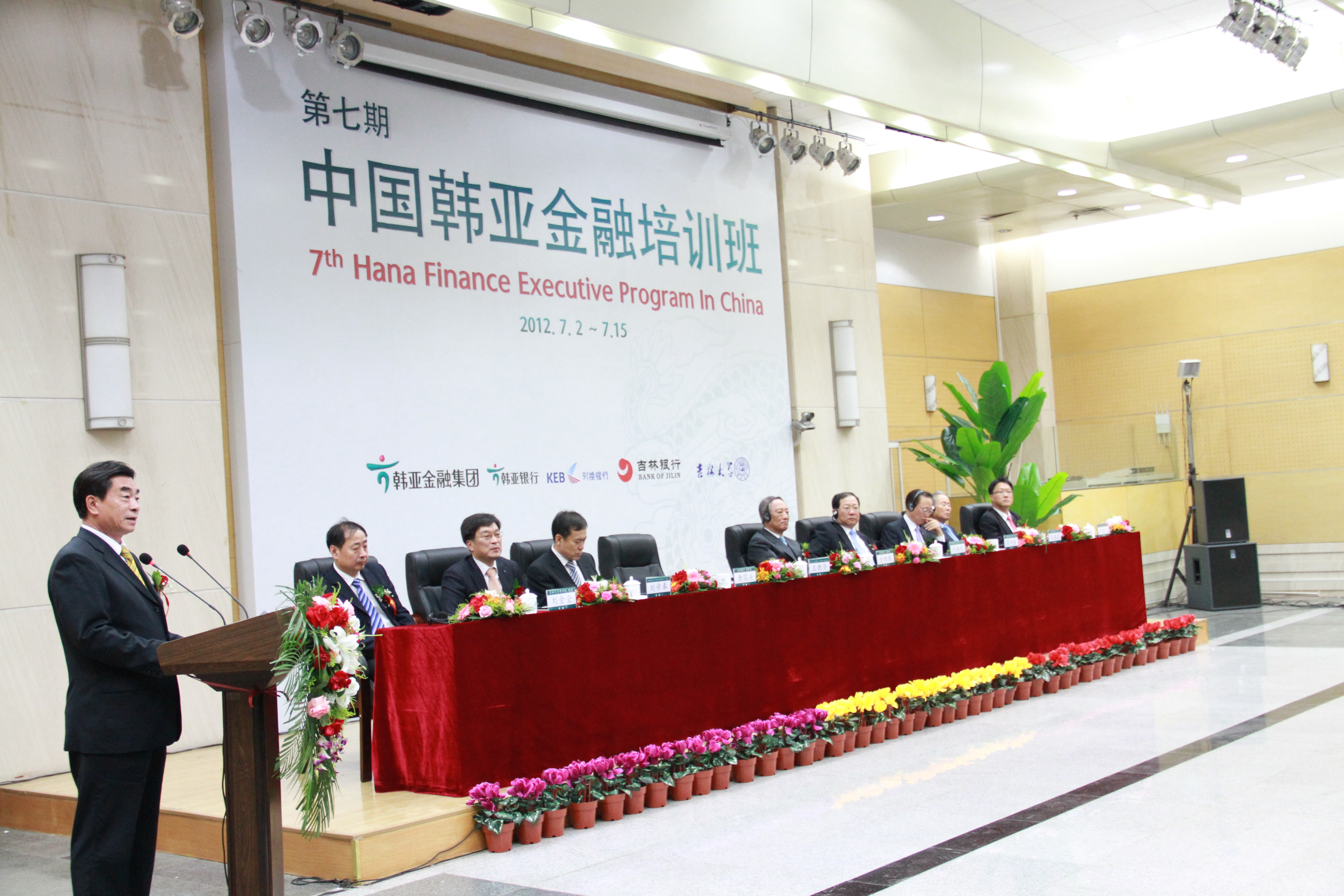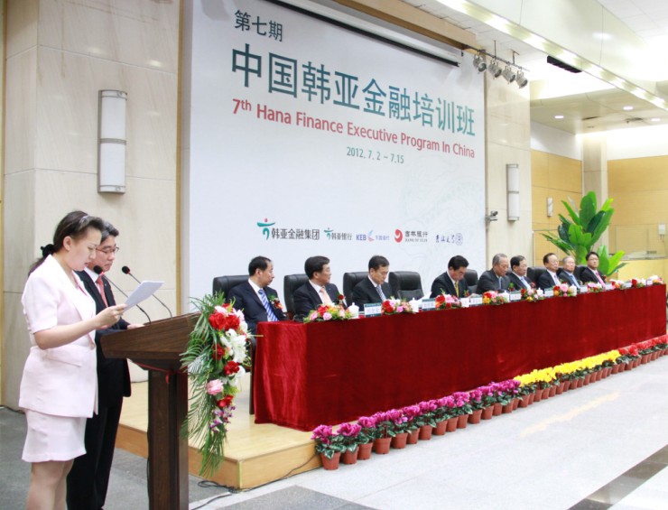 盛夏时节,魅力长春,激情韩亚,完美旅程。2012年7月2日上午9:20分,第七期中国韩亚金融培训班开学典礼在吉林大学中心校区国际会议中心隆重举行。前韩亚金融集团会长,韩亚高中董事长金胜猷先生、韩国银行联合会会长朴炳元先生、韩亚金融集团社长崔兴植先生、前首尔银行行长张满花先生、韩国驻中国大使馆 参赞(财经官)白龙天先生、韩亚银行(中国)有限公司行长刘帝奉先生、吉林大学党委常委常务副书记兼副校长王胜今先生、吉林银行董事长唐国兴先生、吉林大学商学院院长刘金全先生等参加了开学典礼仪式。仪式由韩亚金融经营研究所知识经营室室长尹炳洙先生和吉林大学商学院副院长金晓彤教授共同主持。