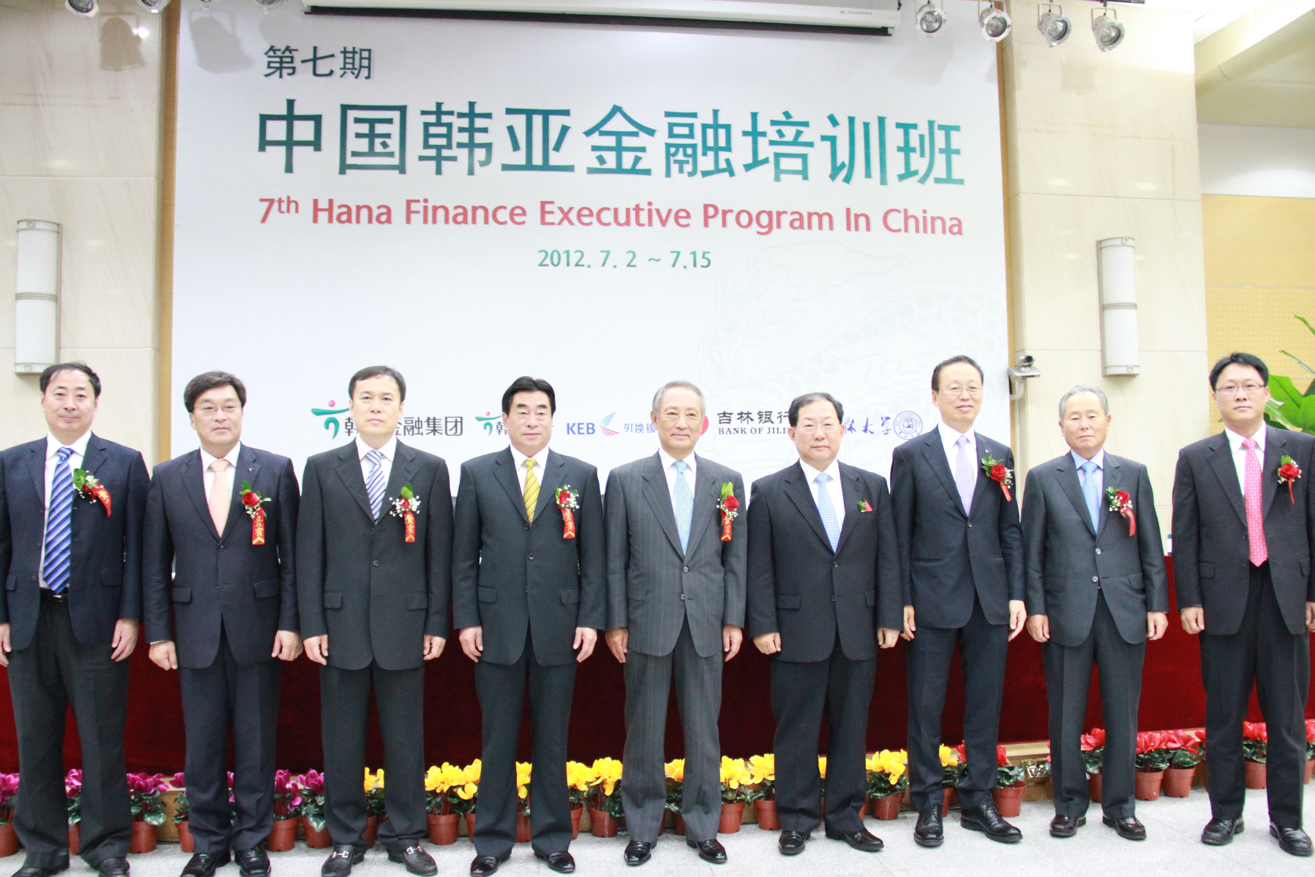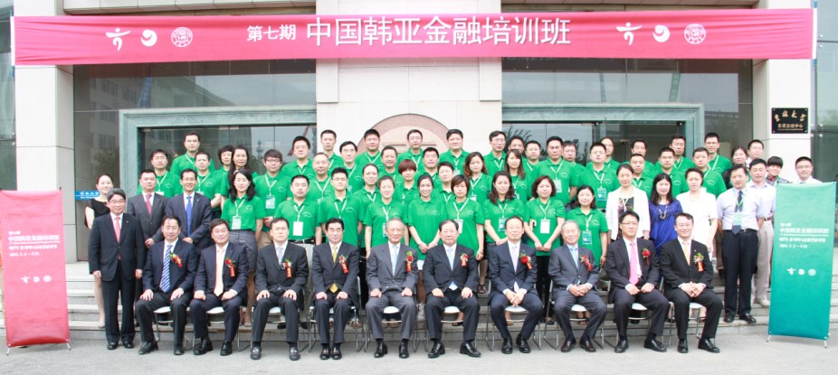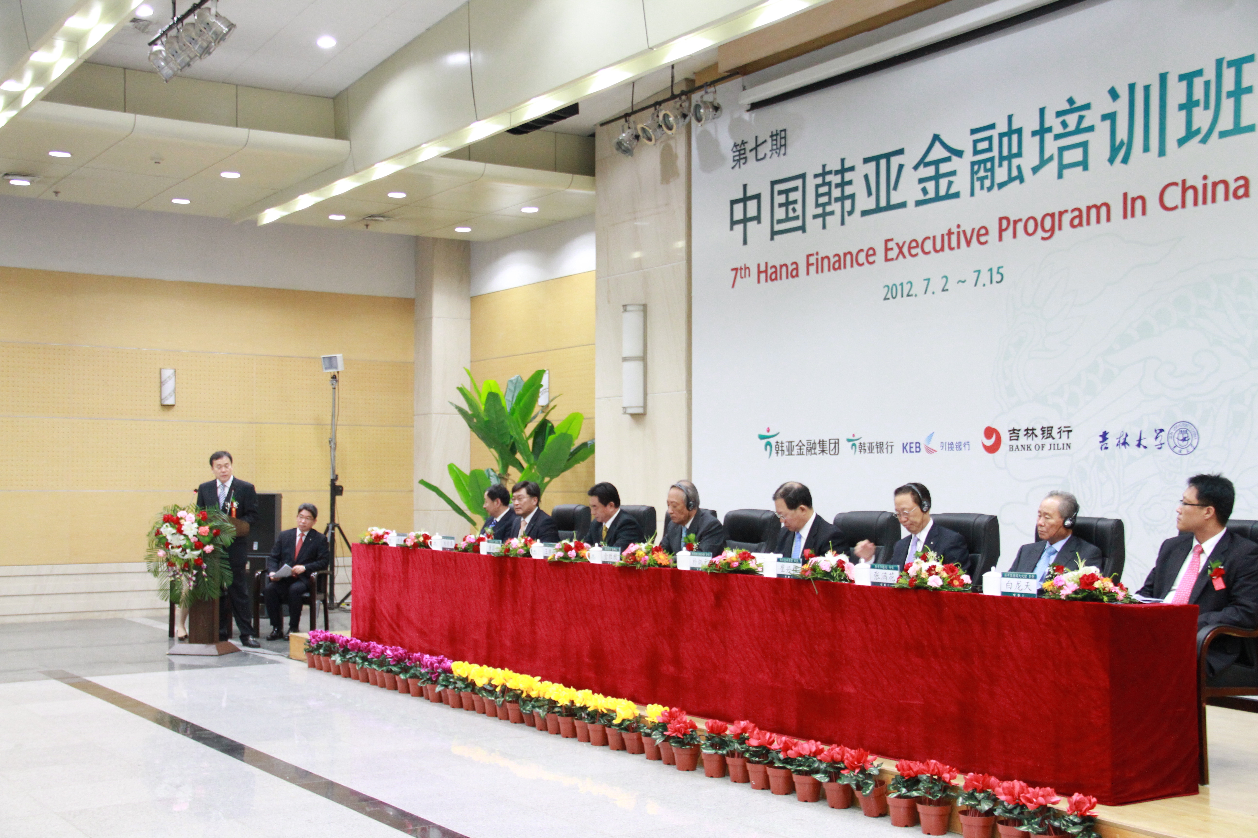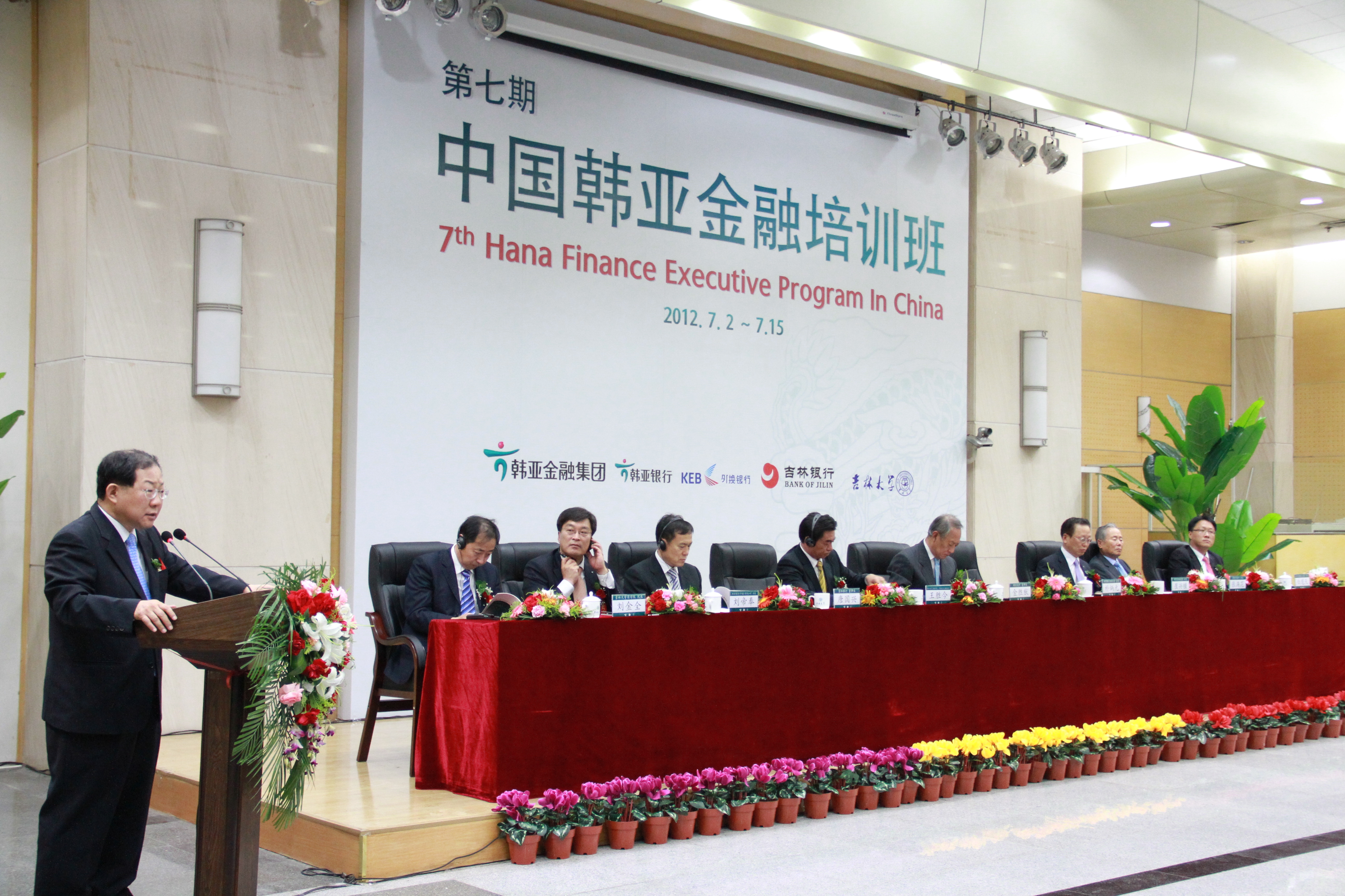 盛夏时节,魅力长春,激情韩亚,完美旅程。2012年7月2日上午9:20分,第七期中国韩亚金融培训班开学典礼在吉林大学中心校区国际会议中心隆重举行。前韩亚金融集团会长,韩亚高中董事长金胜猷先生、韩国银行联合会会长朴炳元先生、韩亚金融集团社长崔兴植先生、前首尔银行行长张满花先生、韩国驻中国大使馆 参赞(财经官)白龙天先生、韩亚银行(中国)有限公司行长刘帝奉先生、吉林大学党委常委常务副书记兼副校长王胜今先生、吉林银行董事长唐国兴先生、吉林大学商学院院长刘金全先生等参加了开学典礼仪式。仪式由韩亚金融经营研究所知识经营室室长尹炳洙先生和吉林大学商学院副院长金晓彤教授共同主持。