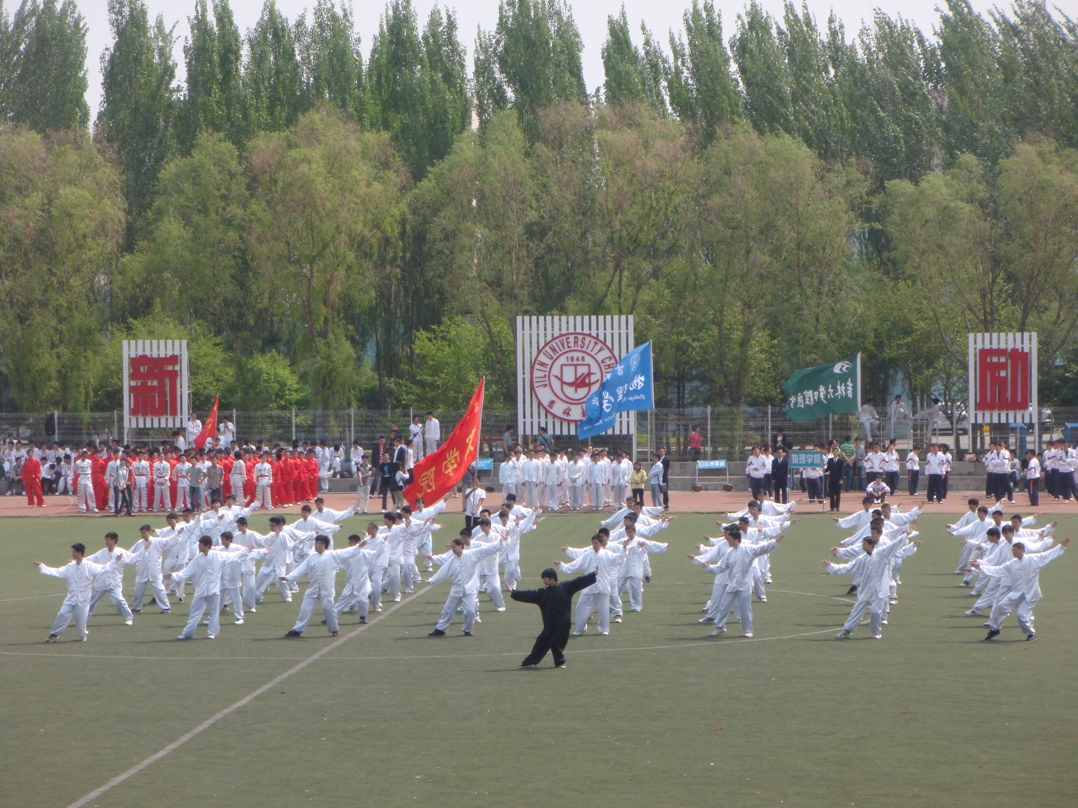 5月19日上午,吉林大学各院三路长拳参赛同学在前卫南区体育场集合,进行着三路长拳比赛的预赛。商学院参赛同学身着统一的白色衣服,早早来到体育场,进行最后的演练。