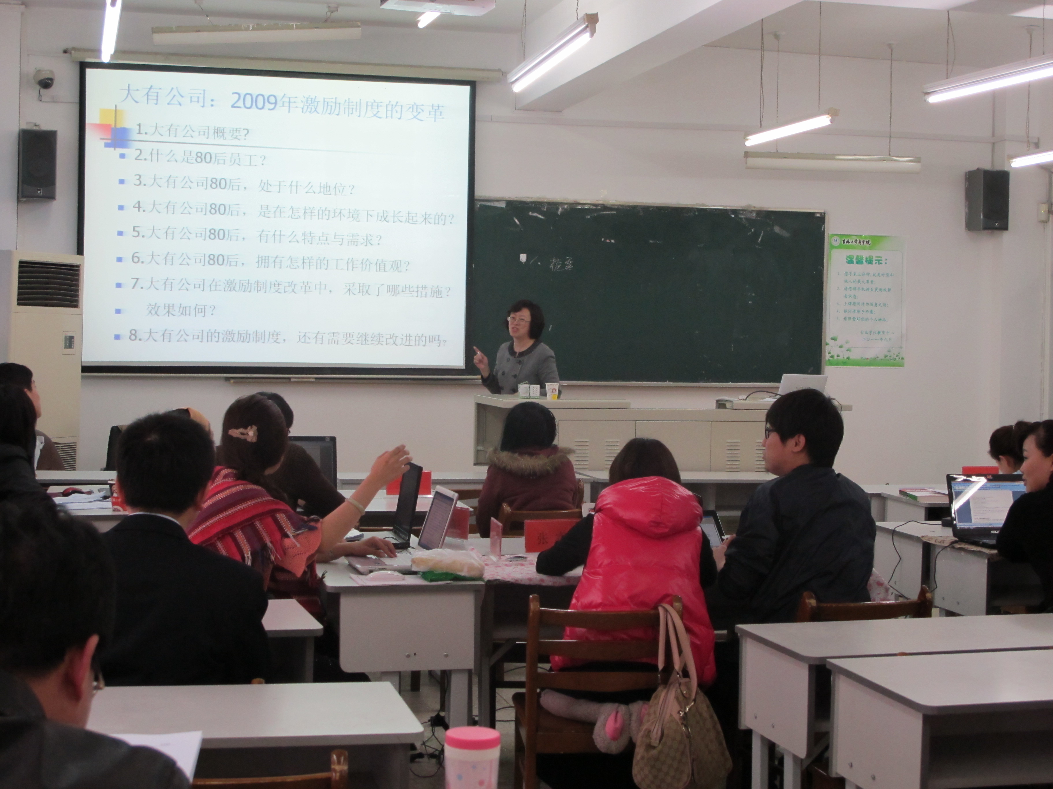 4月20日下午14:00,商学院MBA案例教学观摩课(人力资源管理)在逸夫教学楼215室举行。此次观摩课的主讲人是人力资源系主任于桂兰教授,选用的案例是薪酬管理体系案例——大有公司:2009年激励制度的变革。2011级MBA全脱产班学员参加案例讨论。商学院部分教师应邀观摩。