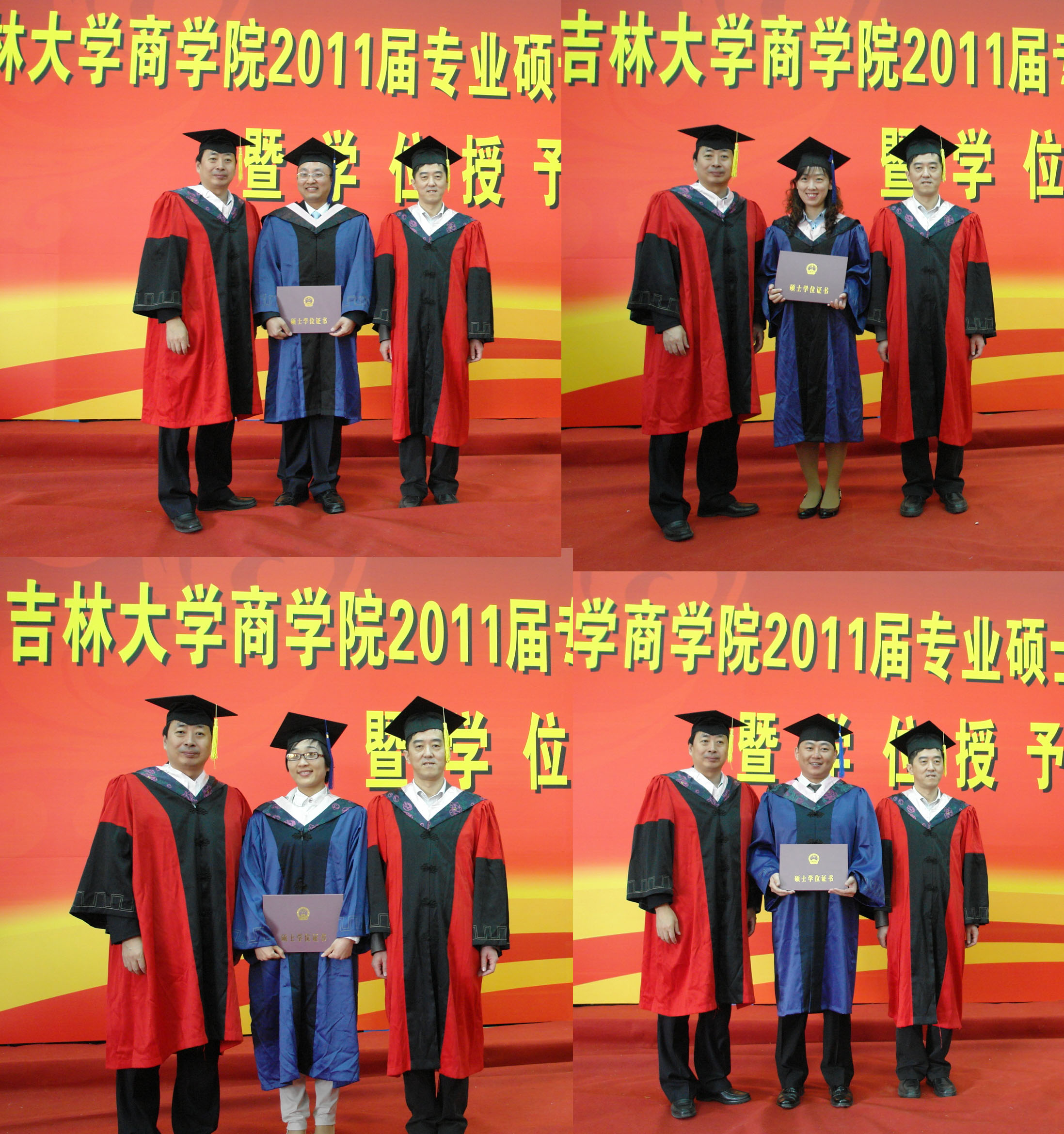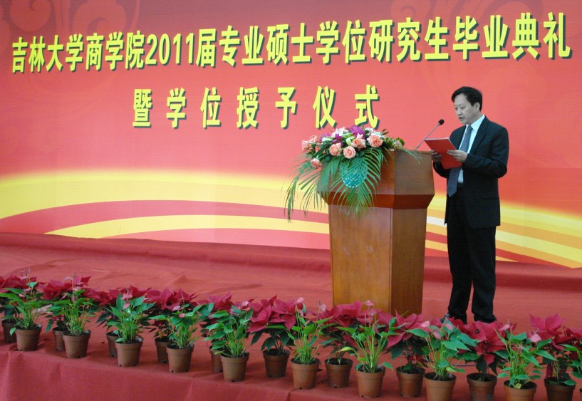 2012年5月5日上午9时,商学院2011届专业硕士学位授予仪式暨毕业典礼在吉林大学中心校区数学楼二楼报告厅隆重举行。吉林大学商学院院长刘金全教授、商学院党委书记蔡志刚老师、商学院副院长庞晓波教授、商学院副院长邹国庆教授、商学院副院长金晓彤教授、商学院副院长张世伟教授、商学院副书记李立超老师、商学院专业学位教育中心招生办主任王世强老师、商学院专业学位教育中心学位办主任李怀日老师莅临了本次典礼。典礼由商学院副院长沈颂东教授主持。