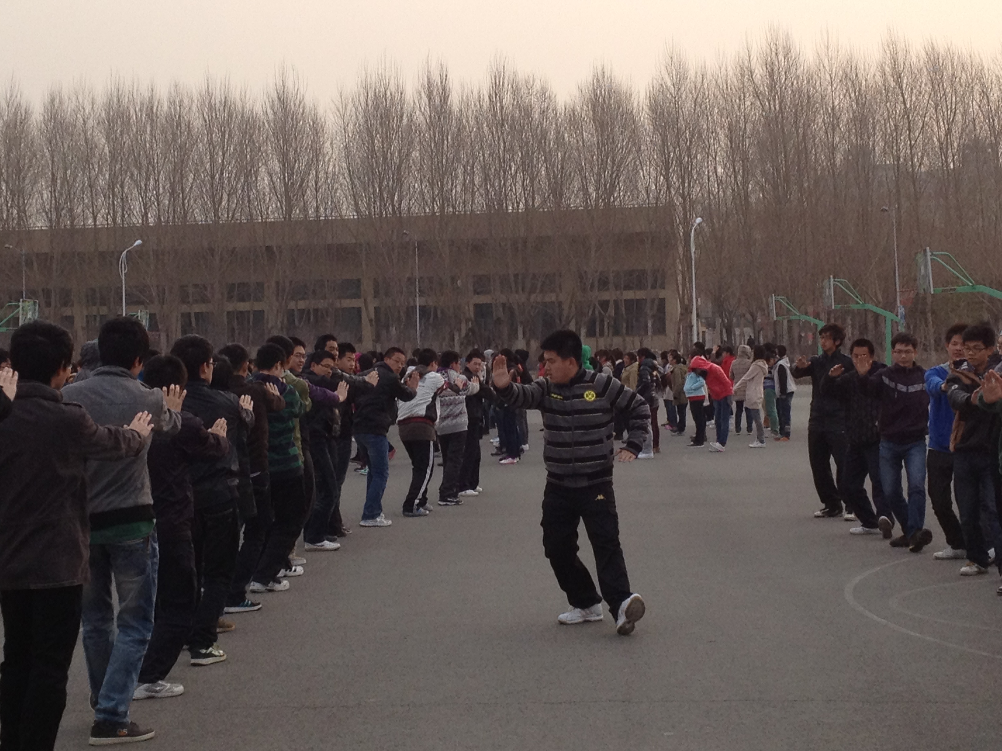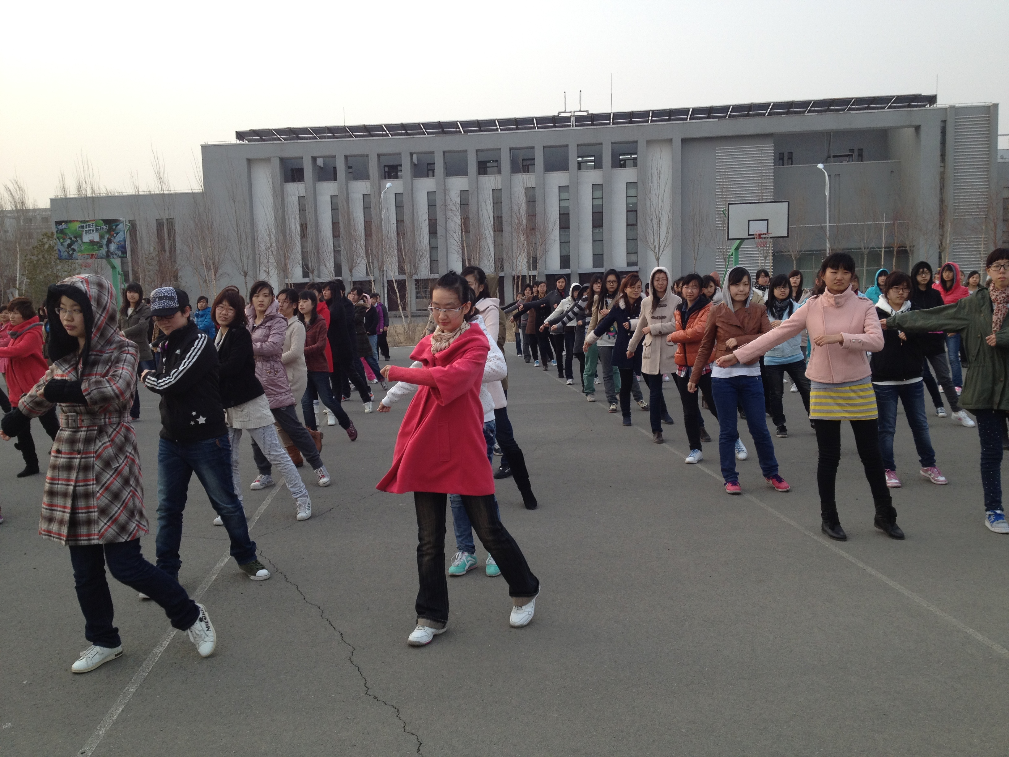 清晨6点,全体同学已在篮球场列队完毕。风沙漫天,但又怎能抵挡同学们坚强的意志与青春的活力。在女生集体大舞队伍的前面,学长学姐们动作标准,解说耐心,对同学们的动作细节不厌其烦地指导。学长学姐们为了让同学们都学会动作,把声音放到最大,与风声竞响。