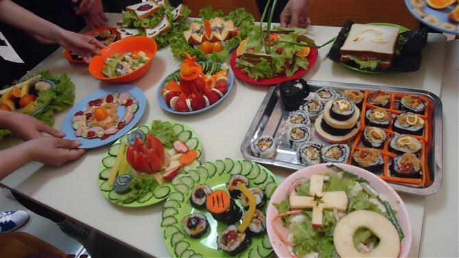 比赛过程中,所有学生被分成五个小组,各组选择完小组菜式所需食材后,比赛正式开始。一番激烈的讨论之后,各组确定要做的菜并进行了分工,有专门切水果蔬菜的,有专门设计造型的,还有打探“敌情”的,各小组内不时传出爽朗的笑声。在忙碌的几小时后,各组端上了各自的成品,形态各异,种类繁多且各具特色,在评选最佳美食时各组成绩不相上下,而评选过后,几乎所有美食都被一扫而空。比赛结束,清理完比赛现场,同学们还纷纷谈论着比赛,称赞食物精美的造型和可口的味道,也为自己在比赛中所做的贡献和新的收获而高兴。