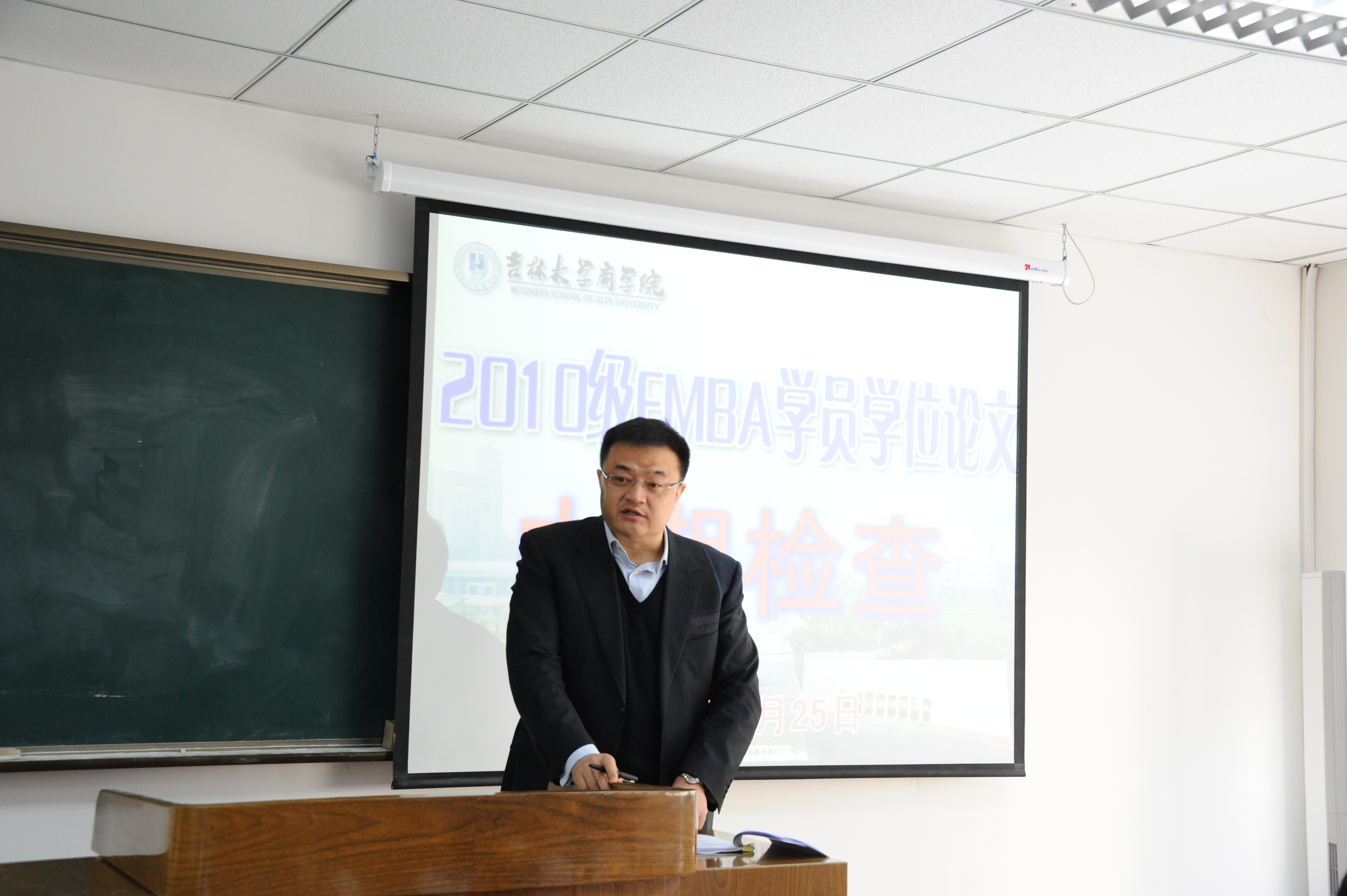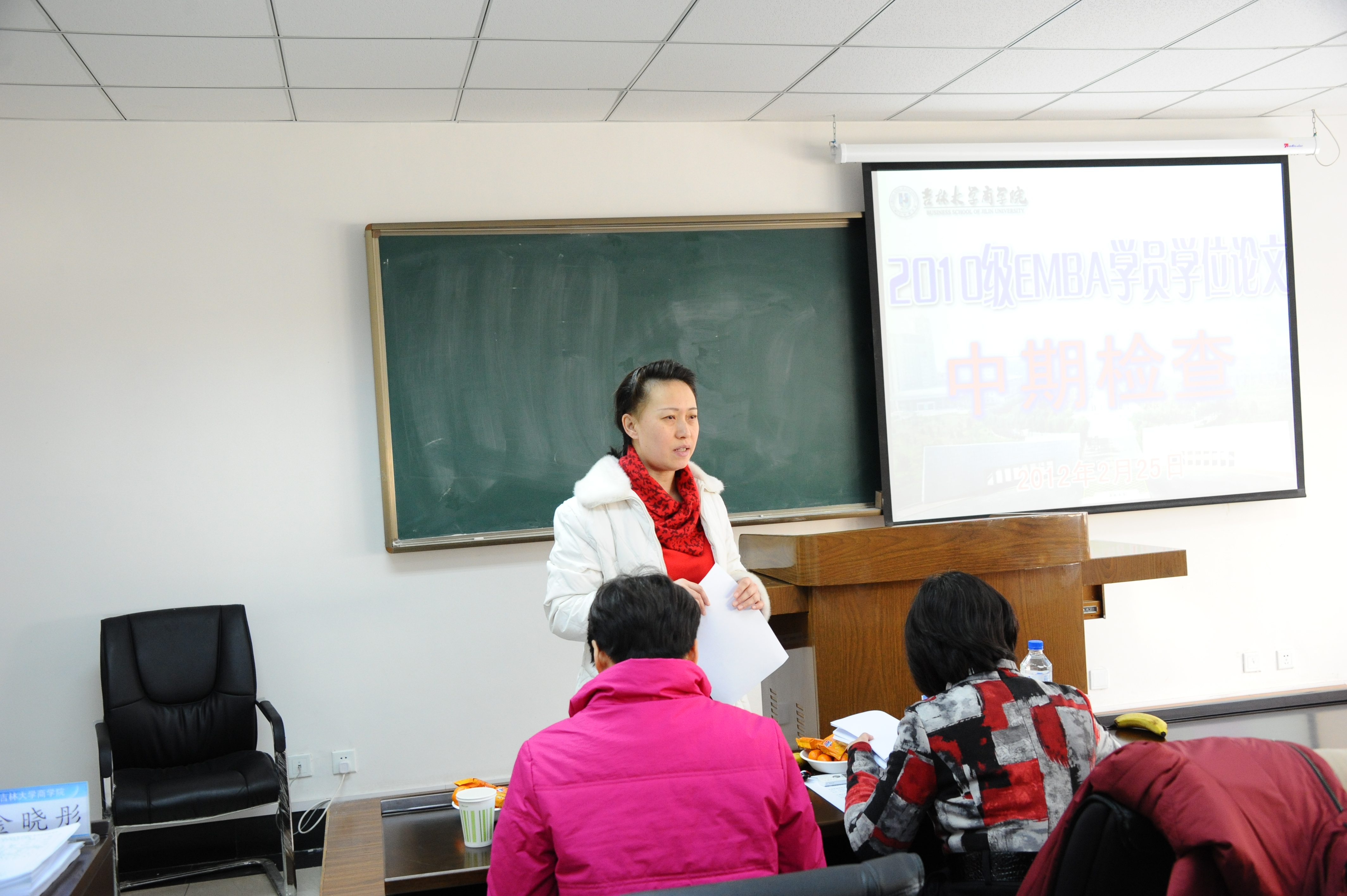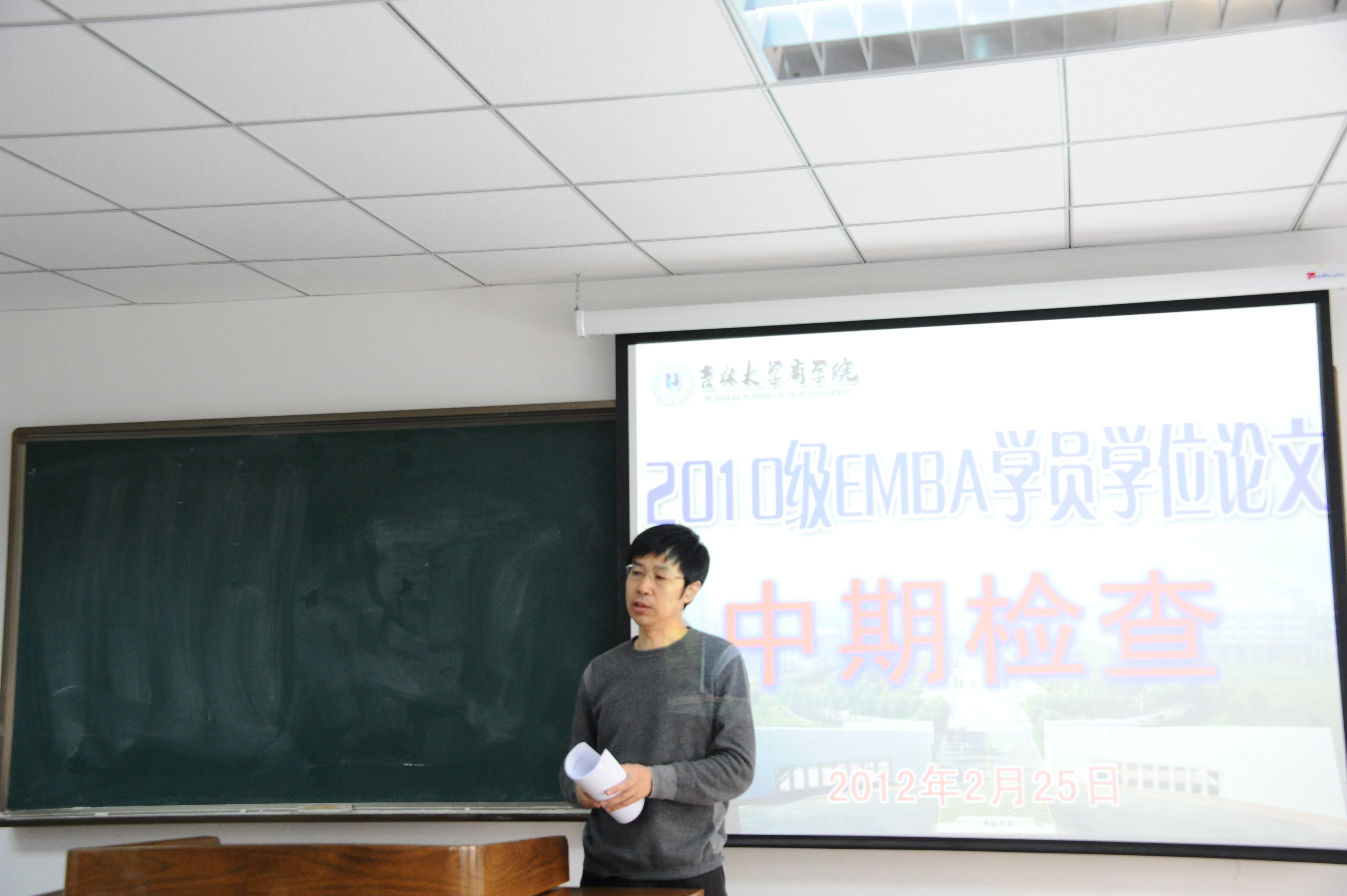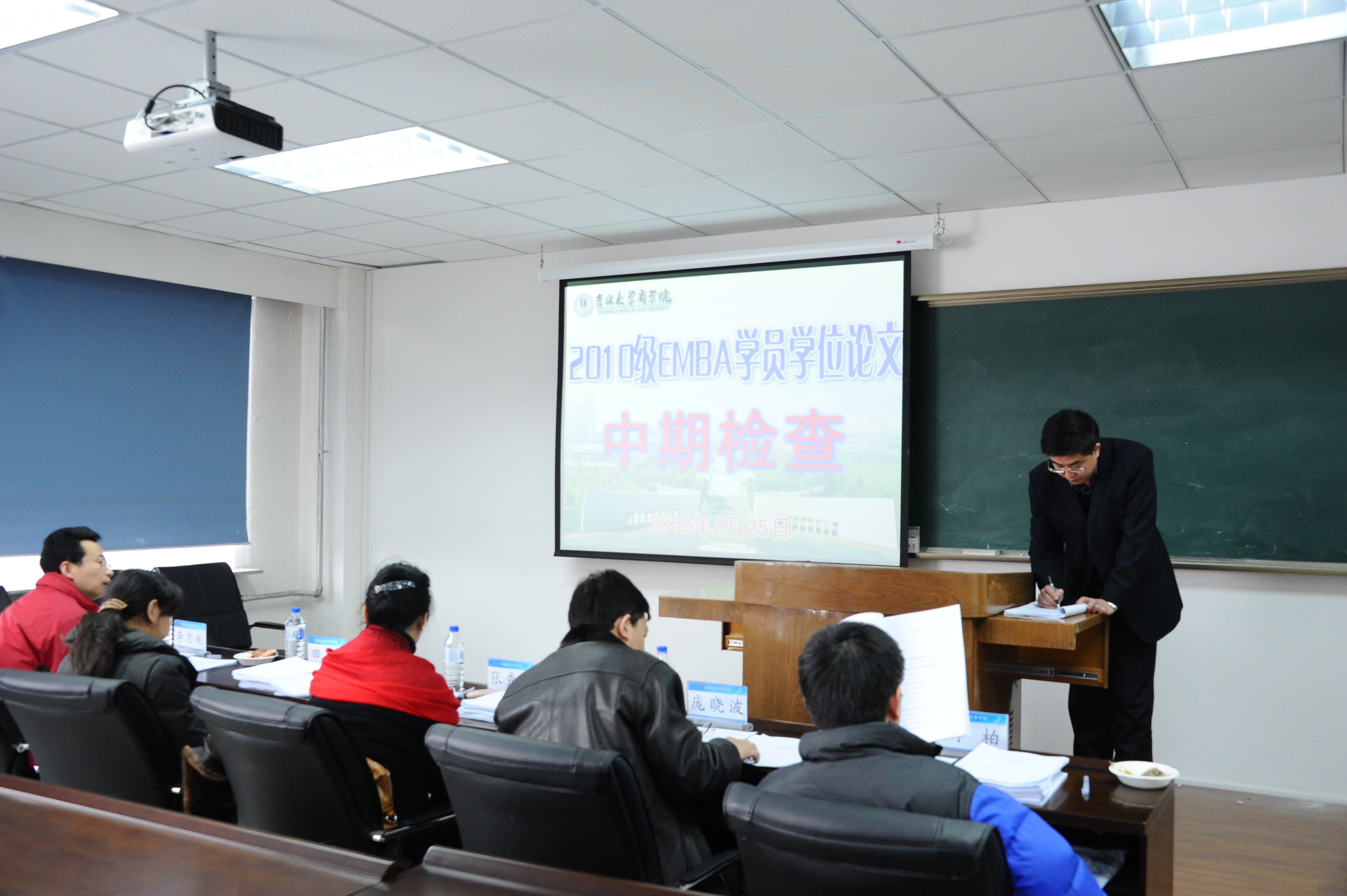 2012年2月25日,2010级EMBA学员首批学位论文中期检查报告会在经信教学楼EMBA教育中心210室、218室如期举行。根据学员们论文选题的方向,为了对学员更好的指导,EMBA教育中心具有针对性的安排了十位专家分为二组,组成了中期检查专家组。