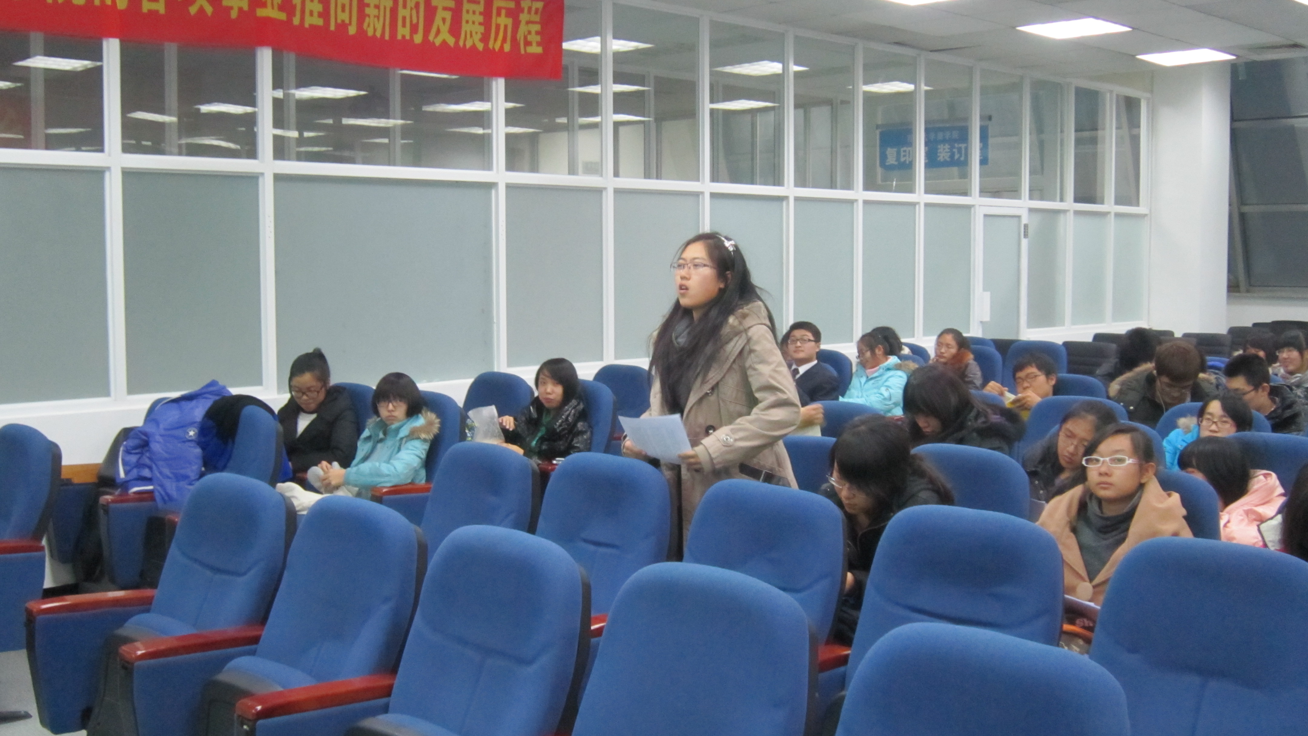 为贯彻十七届六中全会精神,明确大学生历史责任与使命,2011年11月28日,商学院2011级市场营销全体同学在东荣大厦B区310举行了以大学生责任与使命为主题的班会。班会由团支书闫美羲、宣传委员吕金和学习委员符瑞衡共同主持。