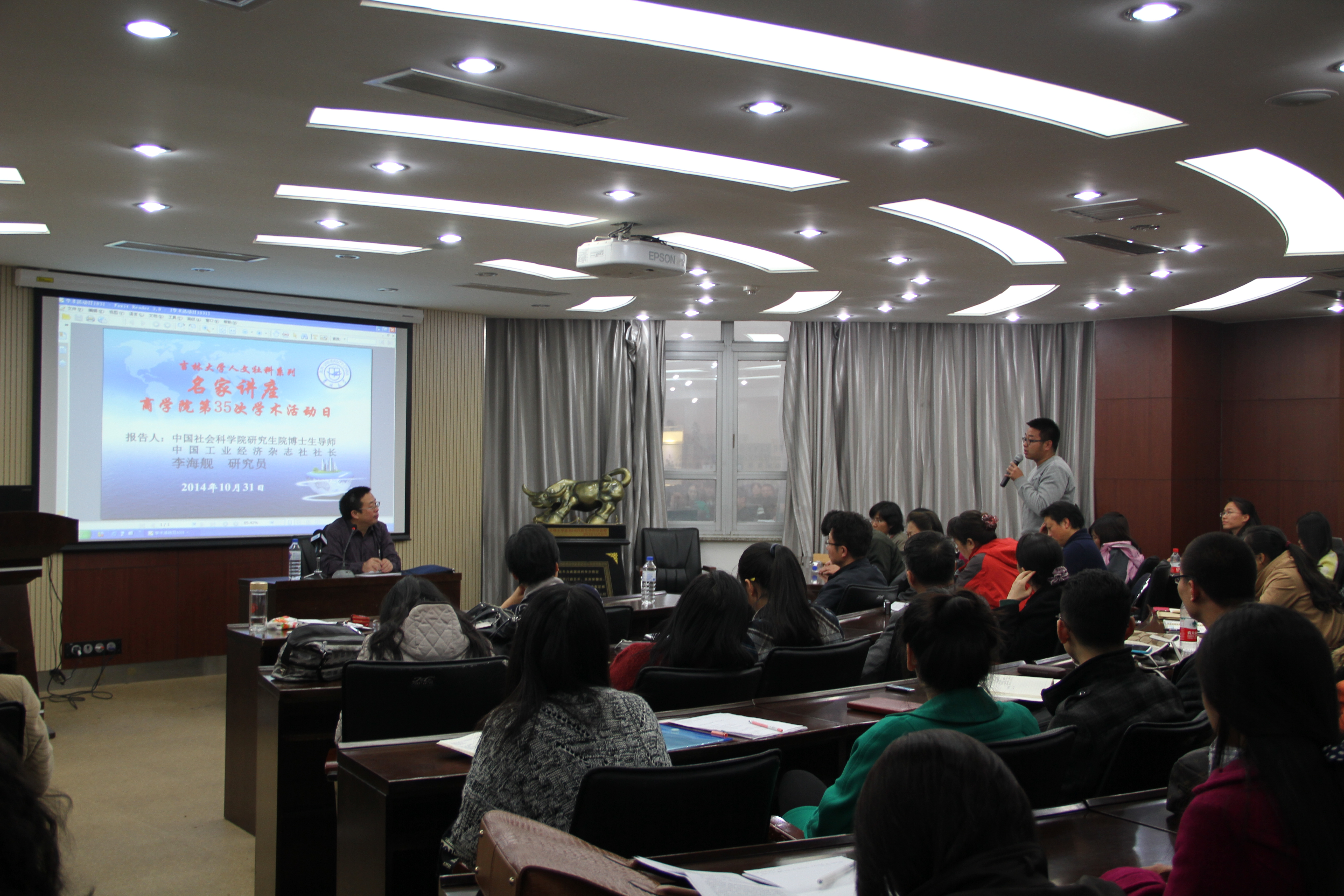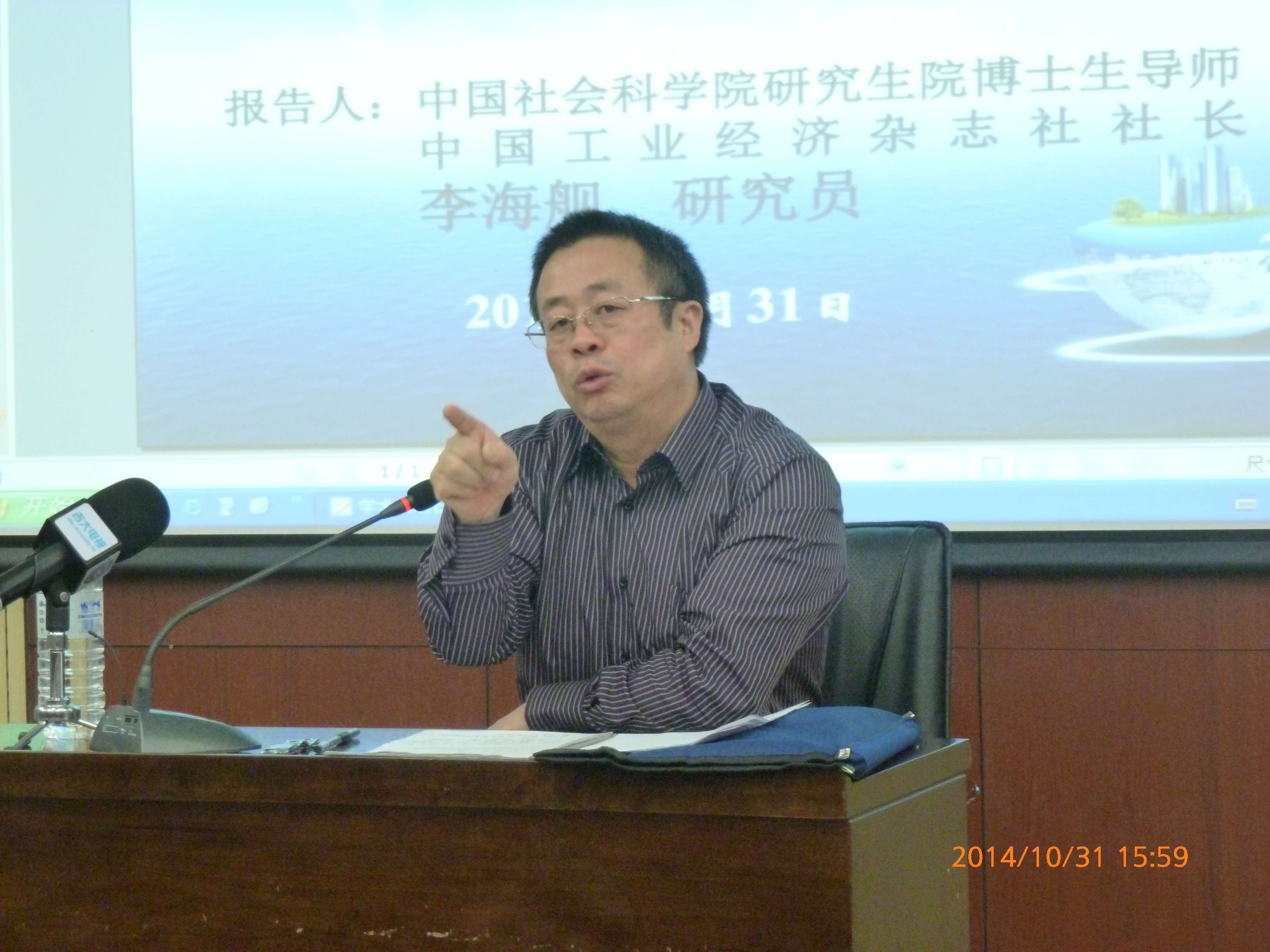 此次学术报告题目为“关于互联网思维与传统企业再造的思考——兼谈学术论文撰写的创新视点”。在报告中,李海舰研究员就目前经济学、管理学研究领域现状进行了分析,提出目前经济学、管理学研究领域所存在的三大问题,就未来学术发展方向展开了探讨,并结合互联网思维与传统企业再造等相关热点问题分享了其对学术创新、学问之道的几点思考。首先,李海舰研究员指出,如今经济学、管理学研究领域存在三大问题:第一,数学至上,过分强调研究工具与研究方法,研究过于依赖数据推演,对实际应用方面的考虑则略显不足;第二,多用相关关系分析代替因果关系分析,数据依赖倾向严重,文献研读及理论推演不足;第三,学术文章表现出重发表、轻使用,重规律、轻思想,重国外、轻国内的不良趋势。李海舰研究员提出,在研究目标方面,学者应正确把握学术研究的功利性与实用性取向,应以造福实践为研究目标;在规范与创新方面,学术研究及文章撰写在形式、内容及方法方面有规律可循,但学者应在掌握范式的基础上超越范式,做有益实践的创新;在期刊选取方面,学者应重视国内期刊,做有益于中国发展的学术创新。然后,李海舰研究员对未来学术方向问题提出了自己的观点。他认为,学术研究应强调问题导向,注重发现研究领域切实存在的问题,不能仅以文献综述作为问题提出。并提出其学于术研究的三个分析层次:首先是数理分析,通过计量结果展示客观现象,但数理结果并不等于分析结论,数理分析仅仅是研究的最初层次;接下来是机理分析,是在客观现象认识的基础上,运用复杂理论揭示问题本质,是数理分析结果的思考,也是研究问题的深度剖析;最后是哲理分析,即在机理分析解决个案问题的基础上,进一步挖掘普遍规律,完成从个例分析到哲理探讨的重大转变。同时,李海舰研究员主张学术应融入国学、回归定性并制造思想,他认为,具有中国特色的学术研究应注重采用系统的思考方式,摆脱数据束缚,深入探讨现实问题背后的机理,揭示问题本质,做能够造福实践的学术,创造“理论顶天、实践立地”的研究。最后,李海舰研究员结合互联网革命的广泛影响、互联网时代的商业变化、互联网时代的商业法则等方面阐述了互联网时代带给企业思维—思想—思路—出路的挑战等方面分享了他对于学术创新、学问之道的几点思考,李海舰研究员指出,学术创新包括选题创新、思维创新、方法创新,同时提出,学者在追求学术创新过程中,一定要保持个体的独立思考,强调学者应拥有自身观点、塑造独立思想并形成属于自己的思想体系。